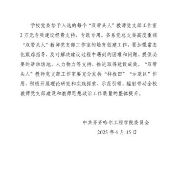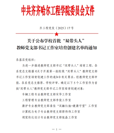 近日,中共齐齐哈尔工程学院委员会发布了《关于公布学校首批“双带头人”教师党支部书记工作室培育创建名单的通知》(齐工程党发〔2025〕17号)我系“工程管理专业教师党支部李俊工作室”被确定为学校首批“双带头人”教师党支部书记工作室培育创建对象。