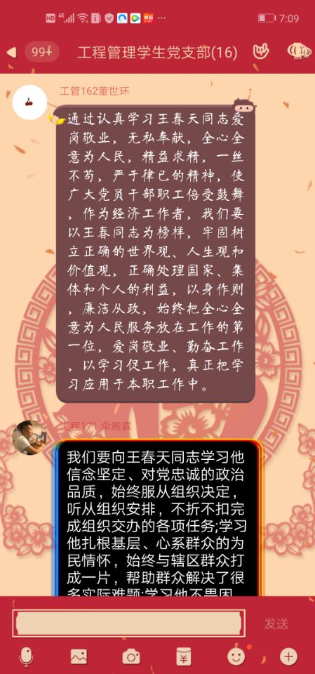 我市民警王春天同志在疫情防控工作开展以来,连续20多天奋战在防控第一线,不幸牺牲在工作岗位上。全体党员认真学习王春天同志爱岗敬业、全心全意为人民服务的精神。作为一名学生党员,要以王春天同志为榜样,学习他信念坚定、对党忠诚的政治品质,始终服从组织决定,听从组织安排,不断增强战胜疫情的政治自觉、思想自觉和行动自觉。