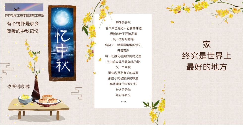 今年的10月1日,既是祖国欢庆之日,又是赏月佳节之时。为进一步弘扬中华民族传统文化,感受我国传统节日的魅力,建筑工程系团总支响应学院团委号召,于10月1日开展以“相距千里,亲情不减”为主题的中秋节活动。