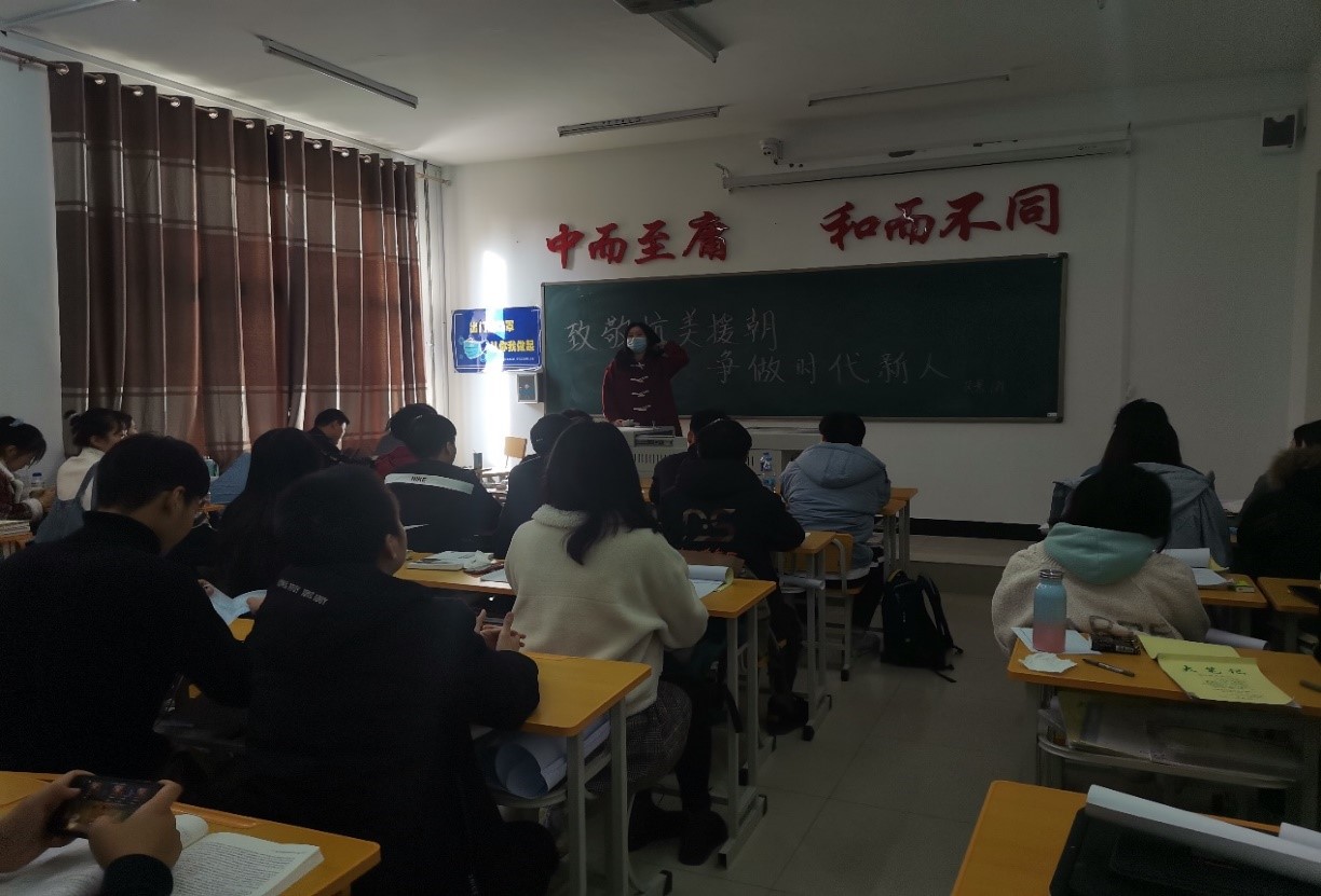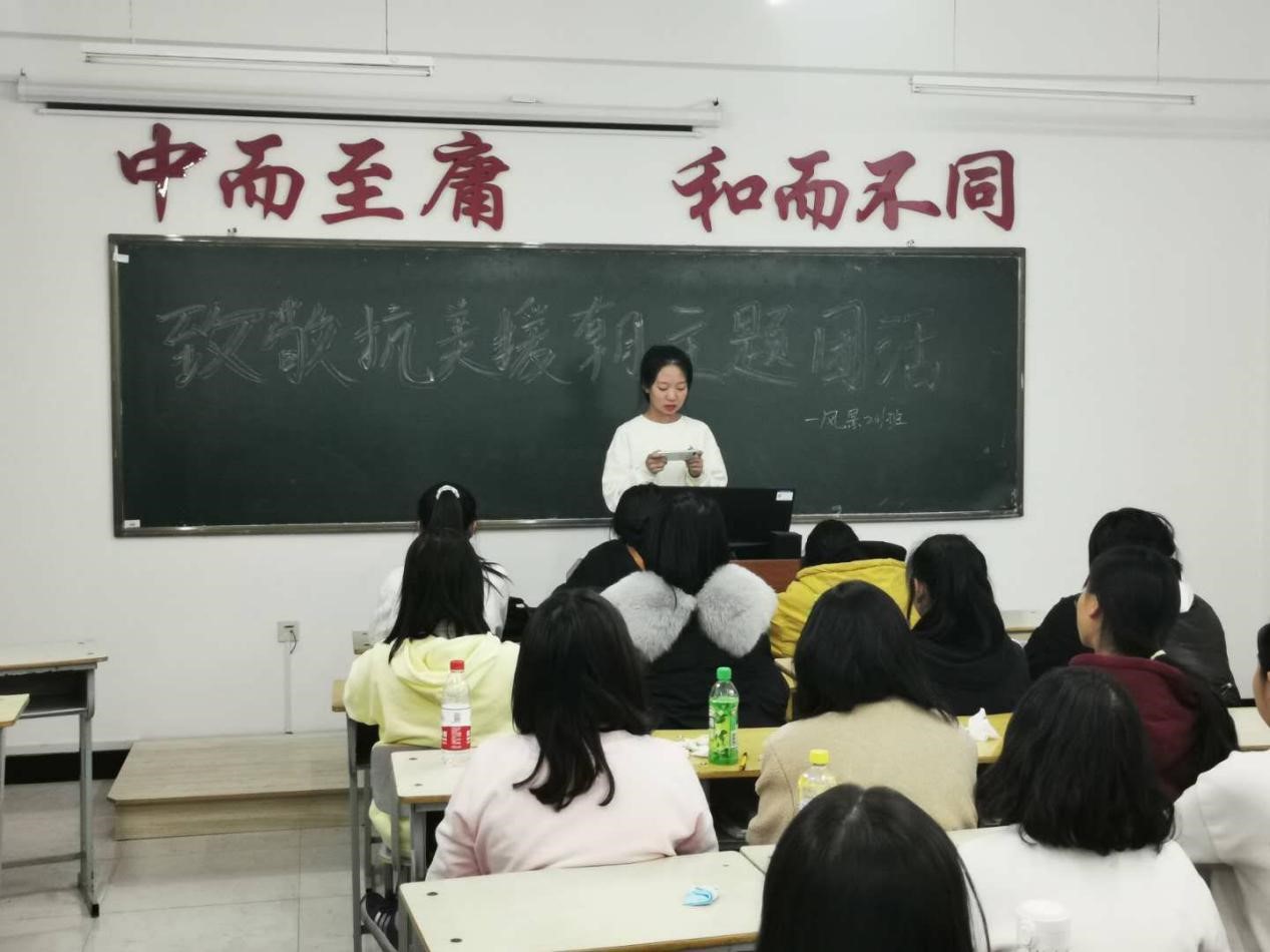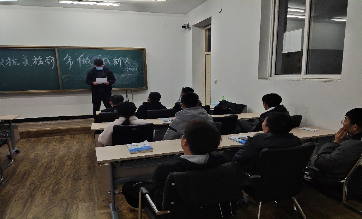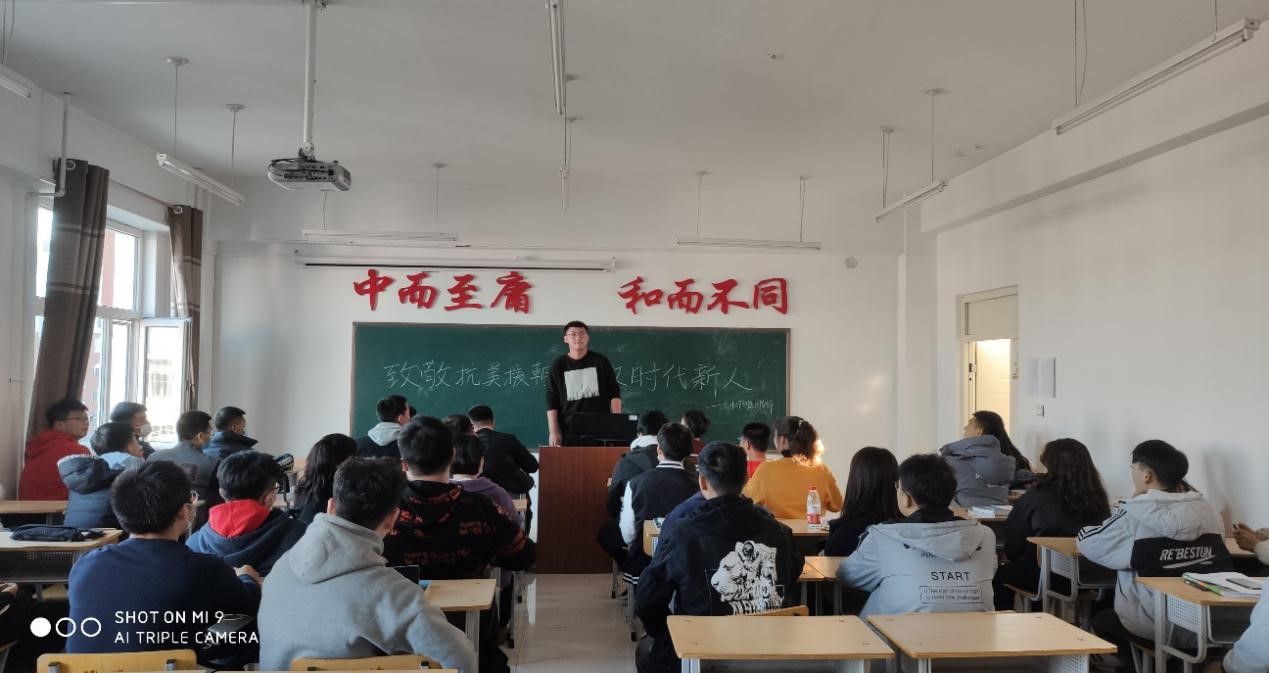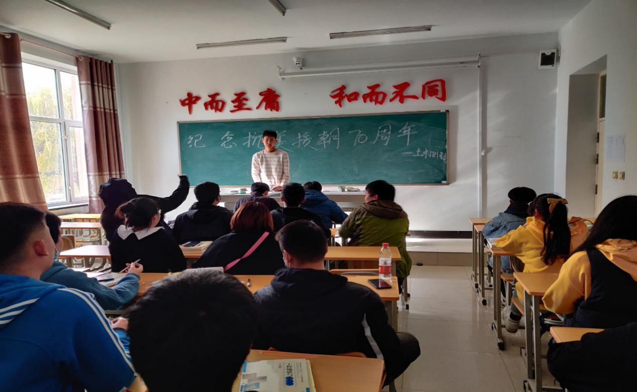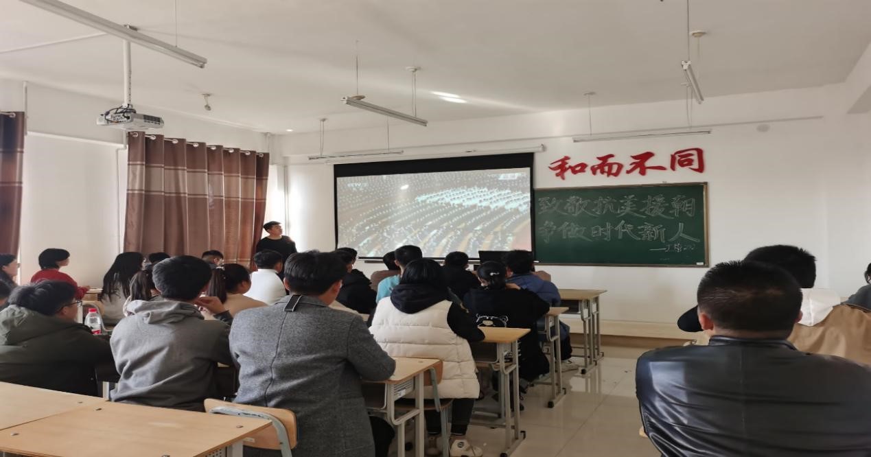 活动上,各班团支书向同学们讲解了抗美援朝战争的时间、背景以及参战的重大意义,并观看“致敬抗美援朝”主题云课视频,通过观看抗美援朝的历史资料和相关画面,为同学们详细解读了抗美援朝对于新中国的深远影响和历史意义。其中,工管201、202班观看《抗美援朝》纪录片,由团支书讲述革命先烈在抗战中的英雄事迹,并由班级同学互谈感想,表达对先辈们的崇敬之情。各班级同学由团支书带领齐唱《中国人民志愿军军歌》,在慷慨激昂的歌声中,同学们仿佛置身抗美援朝的战场,用歌声传递自己的爱国热情。最后,班级全体同学默哀3分钟,深切掉念逝去英烈。