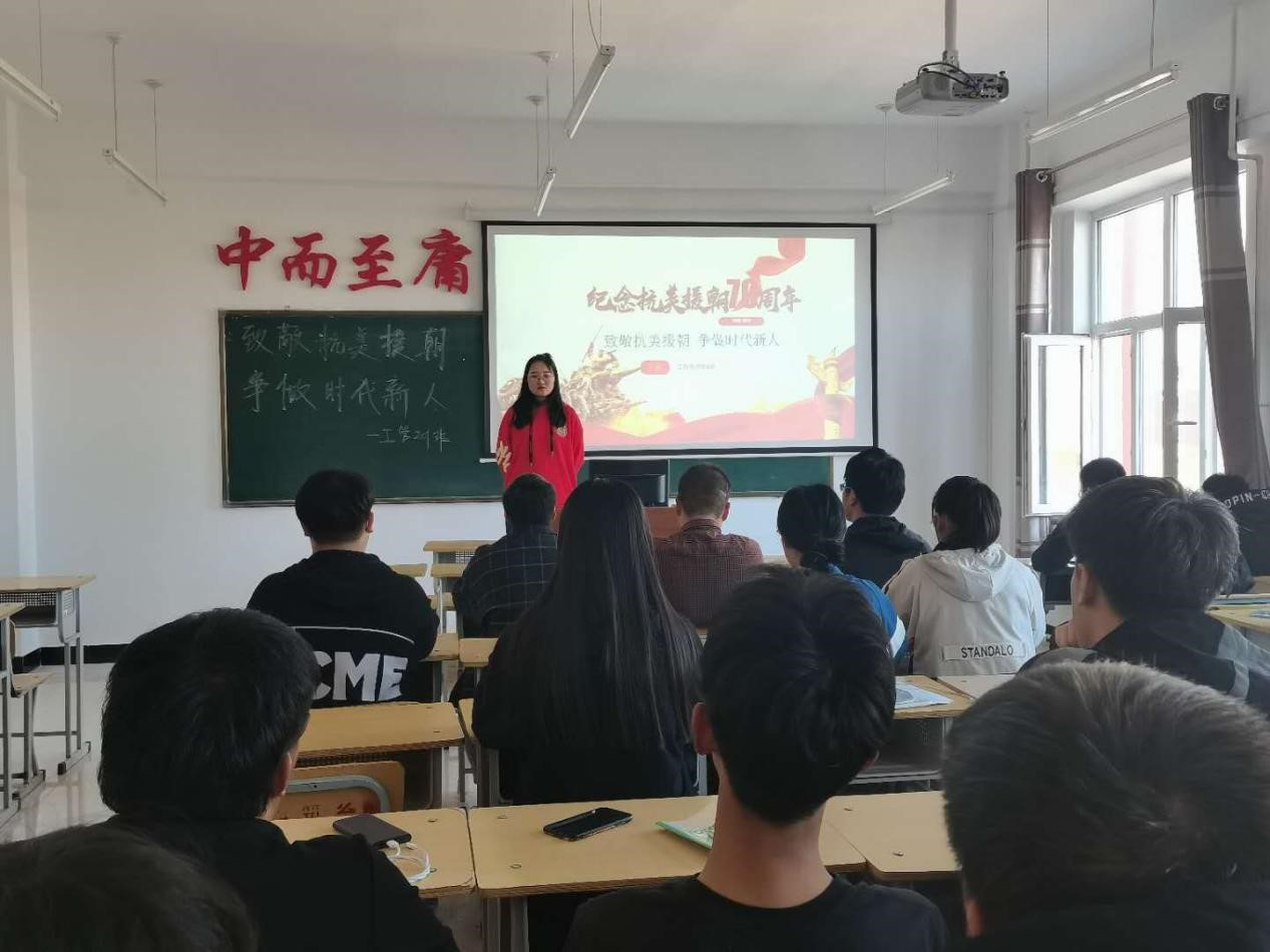 今年是纪念中国人民志愿军抗美援朝出国作战70周年,为传承抗美援朝精神,缅怀志愿军英雄,帮助同学们了解抗美援朝历史,建筑工程系团总支积极组织风景181、土木181、测量181、土木191、土木192、土木193、工管191、工管192、风景191、土木201、土木202、土木203、工管201、工管202、风景201班共15个班级开展了以“致敬抗美援朝,争做时代新人”为主题的爱国主义教育活动。