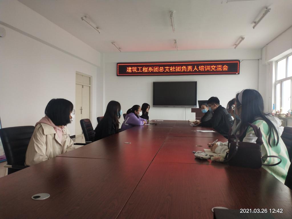 为进一步加强我系社团活动规范化进行,提高各社团工作能力,推进社团队伍建设,2021年3月26日中午,我系在2号教学区2409会议室召开建筑工程系团总支社团负责人培训交流会。会议由学生工作副主任王丽萍、团总支书记宋雪微主持,建筑工程系社团负责人参会。