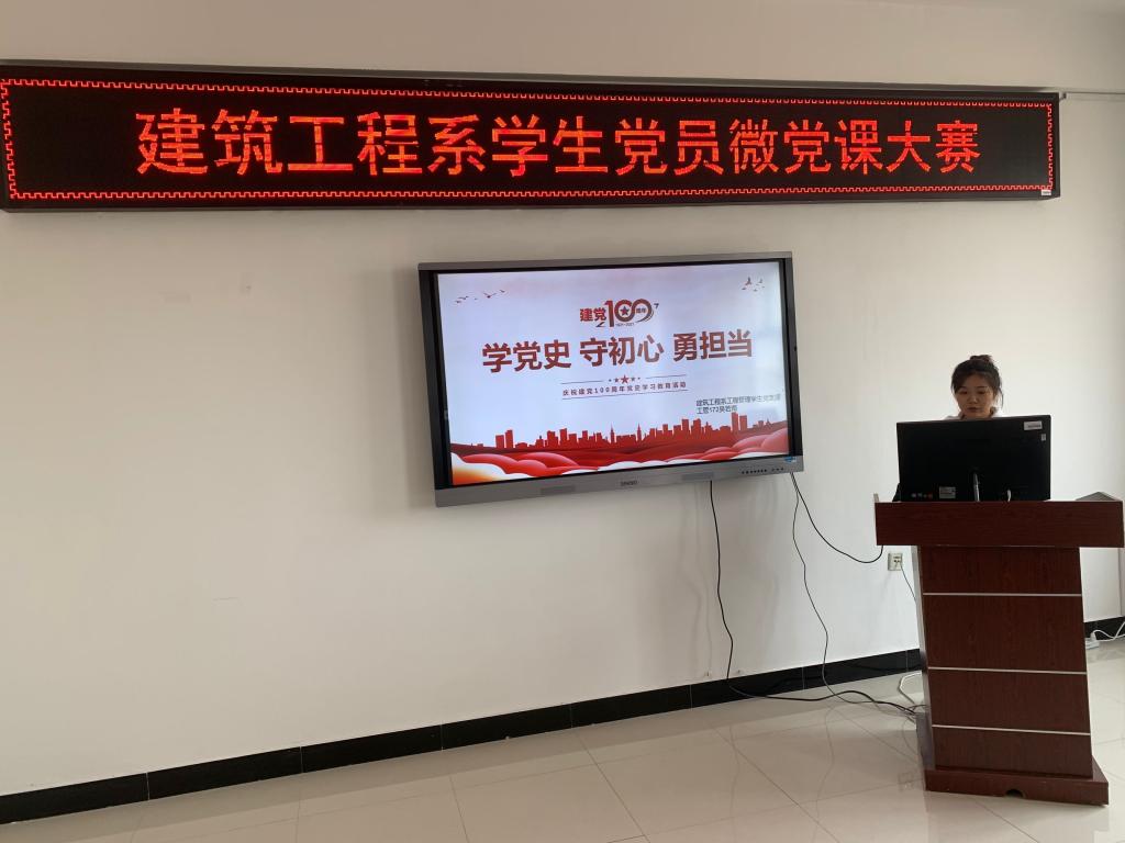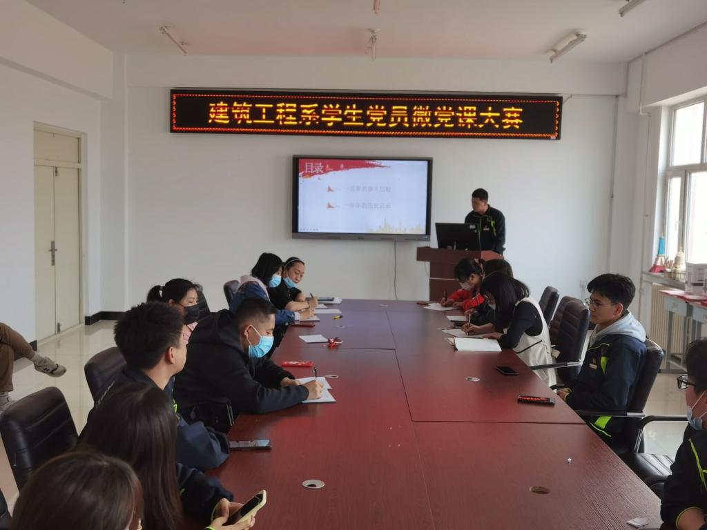 立足新时代展现新担当实现新作为,庆祝中国共产党成立100周年,建校30周年,4月26日中午,在二号教学区2409会议室建筑工程系党总支举办学生党员微党课竞赛,共16名学生党员参加。建筑工程系党总支宣传委员李莹莹主持,评委由建筑工程系党总支书记王丽萍,党总支委员李月凤、李莹莹,党支部书记钟美慧、于敦续、蔡爽,党支部委员张晶晶、姬园梅担任。