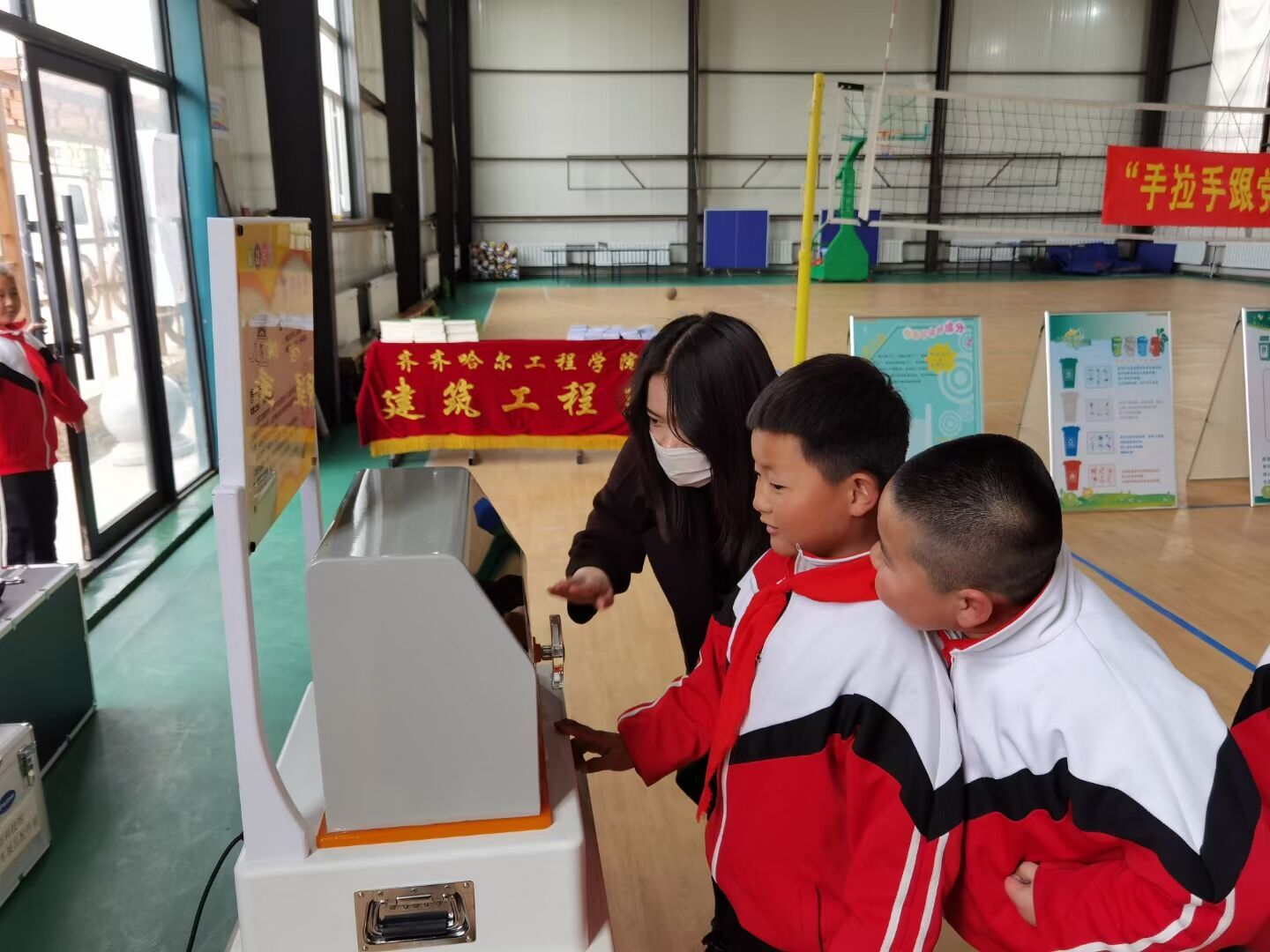 活动前,建筑系土木工程学生党支部书记于敦续老师强调,作为学生干部与入党积极分子,要充分发挥先锋作用,以合格党员标准要求自身,发挥支部的力量,发挥专业的优势,多参与社会实践中去。至此,学生充满热情的开始了本次活动。此次活动主要依托于齐齐哈尔市科技馆的科普器材进行开展,我系团学干部与入党积极分子全程协助市科技馆的工作人员,对相关科普仪器设备进行组装,布置会场,同时将与交通安全相关的资料和图册,发放给梅里斯区雅尔塞镇中心小学校的小学生们,并向小学生们讲解交通安全知识。之后,由志愿者们向学校师生进行讲解、展示了听话的小球、共振环、旋转的银蛋、看谁跑得快、最速降线、磁力转盘、VR眼镜等科普展品,使学校师生大开眼界,小学生们展现出极高的热情,纷纷动手操作科普展品,亲身体验科技所带来的无穷魅力。