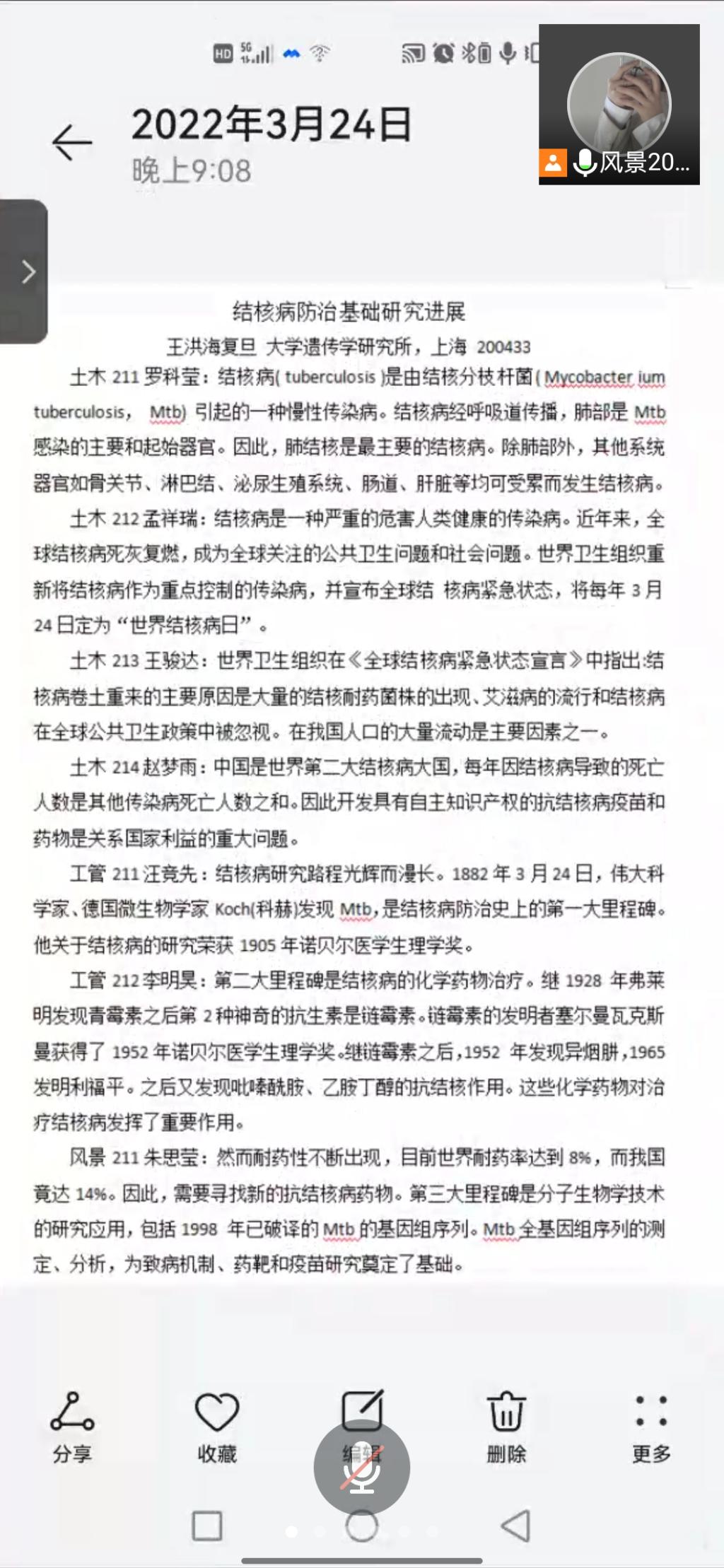 会议伊始,风景201班曹诗笛同学对结核病的危害以及传播方式进行了详细的介绍,曹诗笛同学讲到“肺结核是长期严重危害健康的慢性传染病。结核病又叫“痨病”,由结核杆菌引起主要侵害人体肺部,发生肺结核。得了肺结核如发现不及时,治疗不彻底,会对健康造成严重危害。”随后21级各班团支书就关于结核病防治基础和研究进展以诵读分享的方式进行了宣讲,从结核病的起源,结核病曾造成的严重危害,抗结核药的发现,如若感染结核病不要产生过度恐慌等等多个方面进行宣讲,各班同学都在不同程度上了解到了结核病的危害和预防措施,并表示会将在会议中所学到的预防措施分享给身边的人,将结核病的感染和传播扼杀在摇篮中。