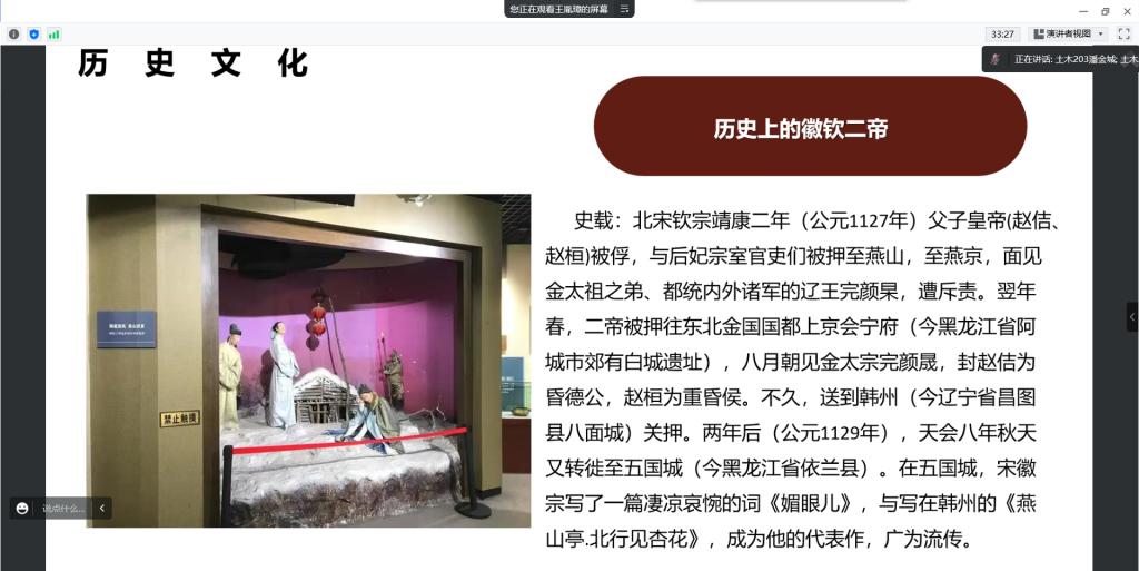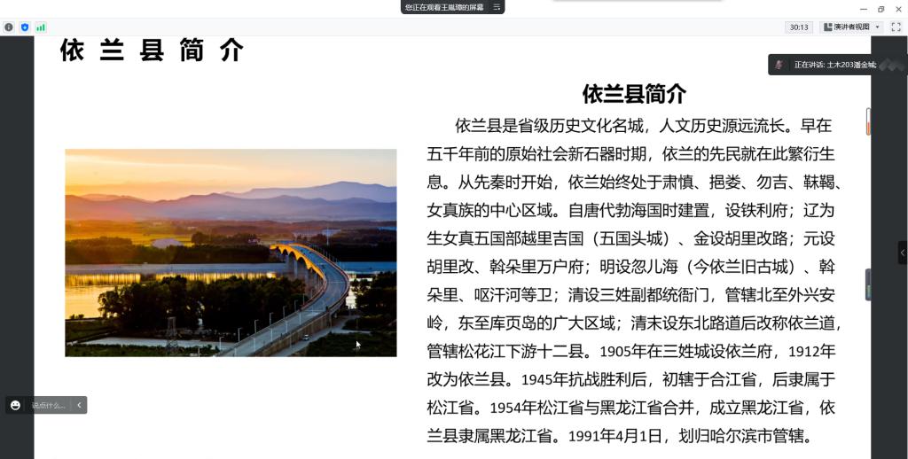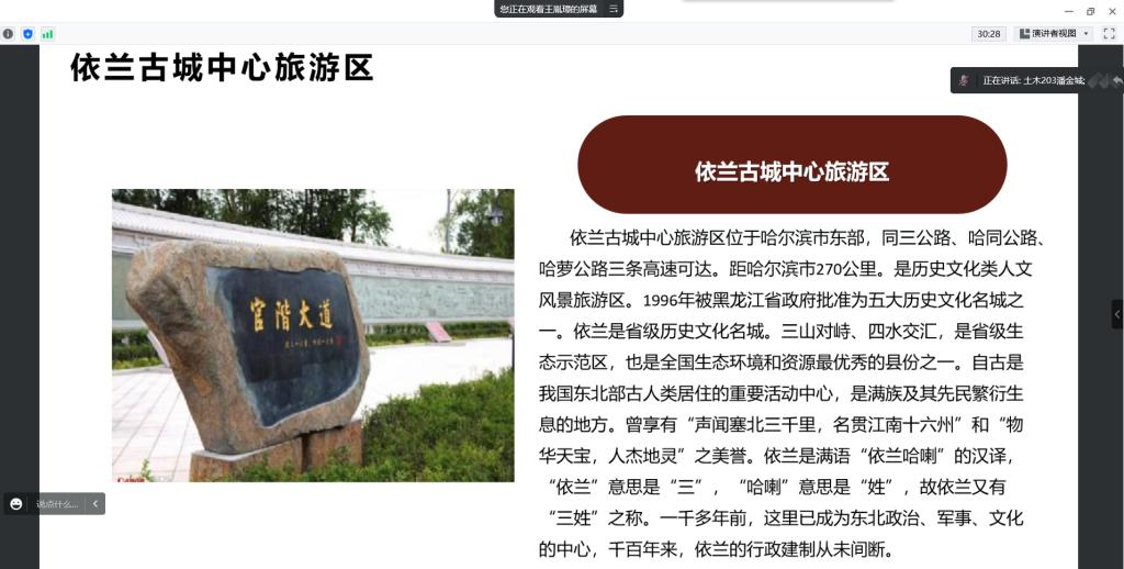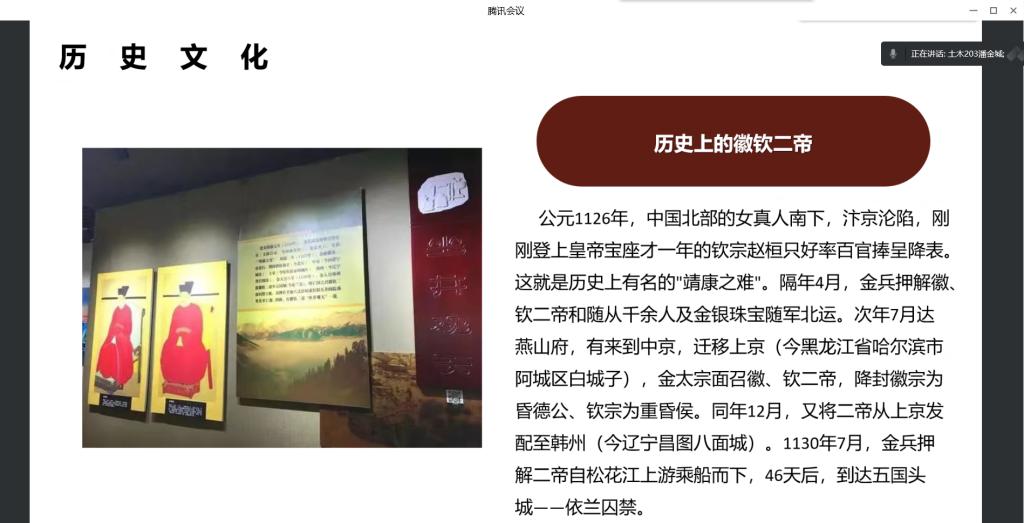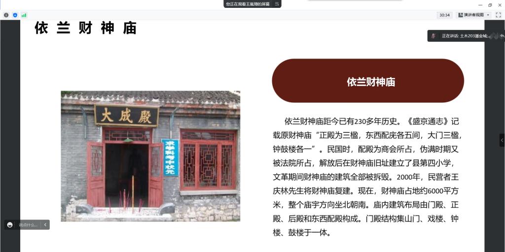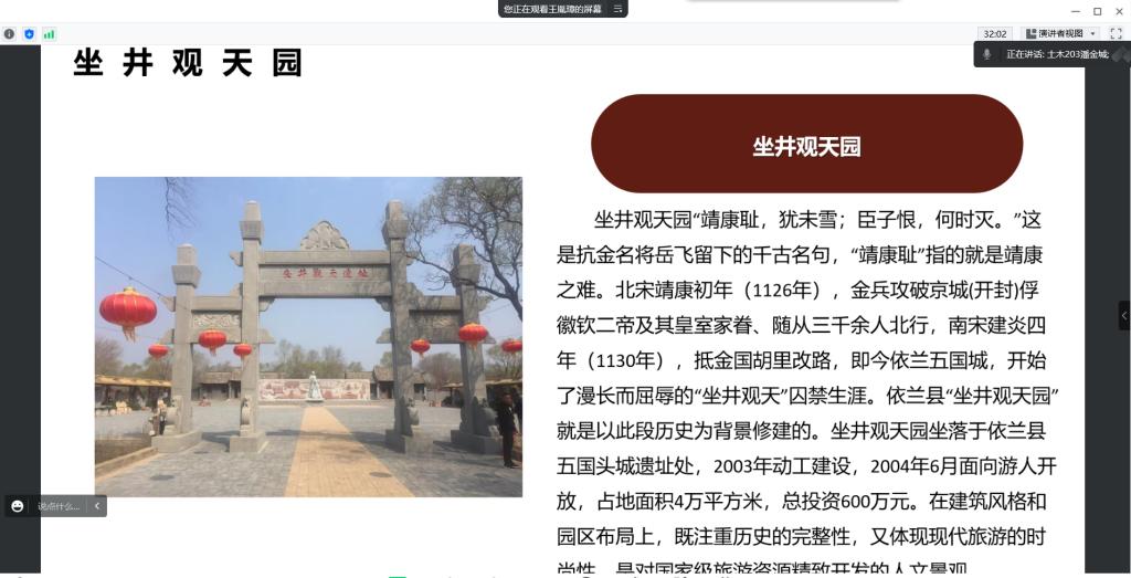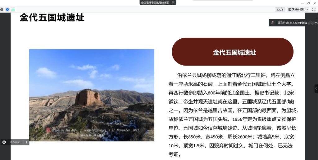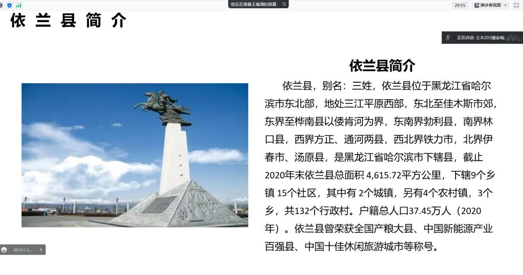 本次活动由纪检部部长潘金城负责,通过组织学生线上参观丹清河国家森林公园、五国城遗址、慈云寺等名胜古迹,观察当地的文化景观,探寻历史足迹,并且深入基层农村,了解当地的风俗习惯,居民生活水平变化等过程,深刻感受国家近年来在乡村特色产业和基层治理发展方面取得的巨大成就,认识到党的领导是我国社会主义各项事业取得胜利的根本保证。