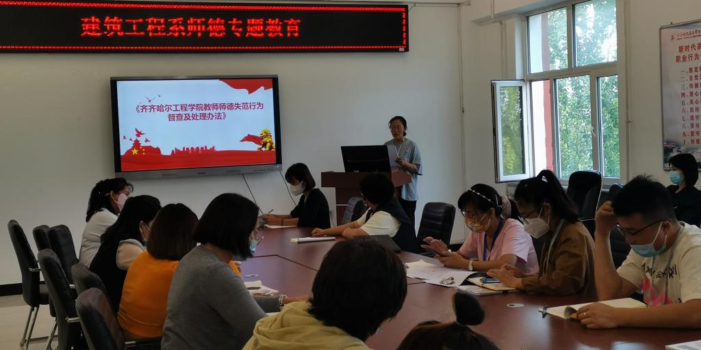 为深入推进师德师风建设,持续强化教师思想政治和师德师风建设工作,建筑工程系按照年度师德专题教育计划安排,于8月30日下午,在二号教学区2409会议室组织教师进行师德专题教育系列活动--师德集中教育。建筑工程系党总支宣传委员李莹莹主持,建筑工程系全体教职工参加。