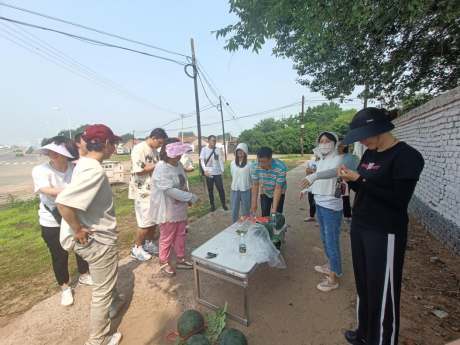 在墙面绘制期间,三合村果会玲副主任为我们带来了当地的特产西瓜,师生在绘制之后共同品尝了甘甜多汁的西瓜。