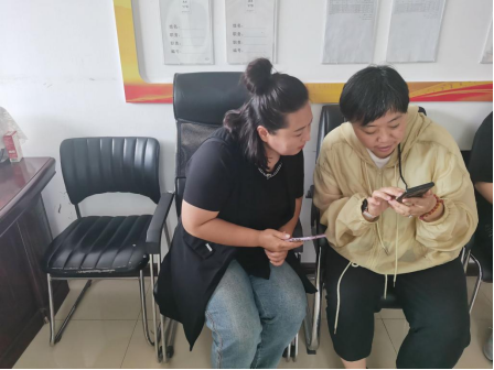 图为:指导教师宋兴蕾与三合村副主任果会玲讨论确定方案时的照片