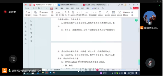 会议分为两部分,首先,赵靖宇布置2024-2025学年第二学期开课资格审查工作,要求教师立足学生专业、课程支撑目标,靶向设计课程。将新时代背景下的专业需求与AI有益结合,营造数智化课堂;同时教育学生AI工具的使用方法,树立正确价值观,思政教育与专业教学紧密结合。