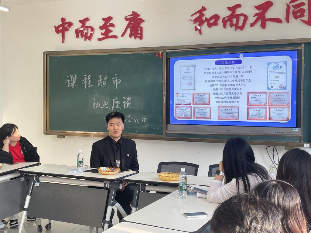本次座谈会由土木202班的李兆田同学担任主讲人。李兆田从自我认知、能力储备以及职业认知等多个维度进行了深入细致的分享与阐述。首先,他强调自我认知在就业过程中的基础性作用。每位同学都应清晰认识自身的优势与不足,进而明确适合自己的职业方向与发展路径。其次,能力储备在就业过程中占据着关键地位。他呼吁在座的同学们要注重课堂学习与实践操作的有机结合,积极参与校外课堂,不断锤炼自己的专业技能和实践能力。此外,李兆田指出同学们在就业前应对目标职业进行全面深入的了解,包括其发展前景、行业趋势以及市场需求等方面。通过充分掌握职业信息,同学们可以更加明智地做出就业选择,为自己的未来发展奠定坚实基础。