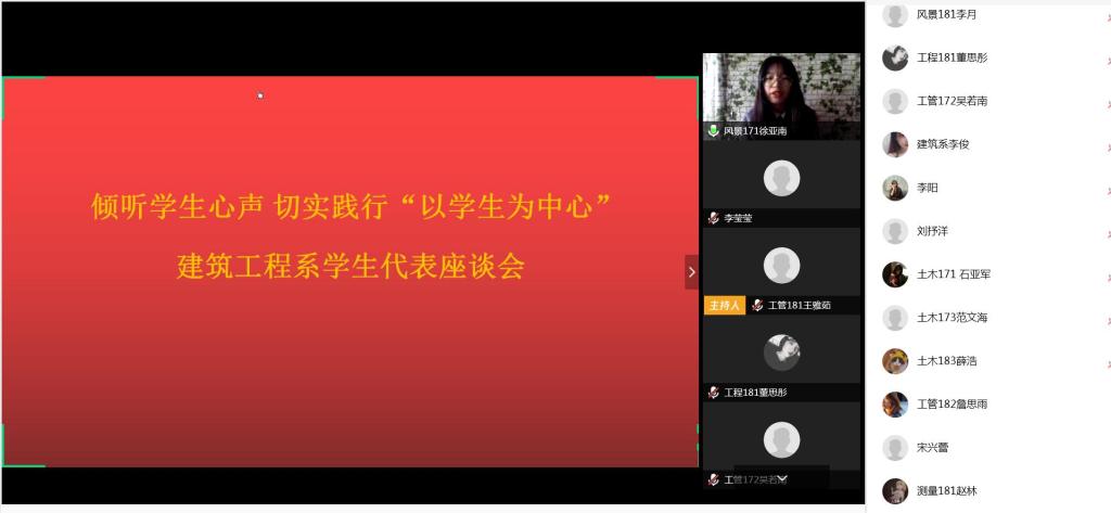 座谈会上,教学副主任徐明首先介绍了建筑工程系三个本科专业和两个专科专业在线教学的运行情况,希望借此机会广泛征集同学意见,实现更好的教学效果。在会议中,所有学委都围绕座谈会提纲中与学习息息相关的问题进行发言,为在线教学工作提出宝贵意见和建议。