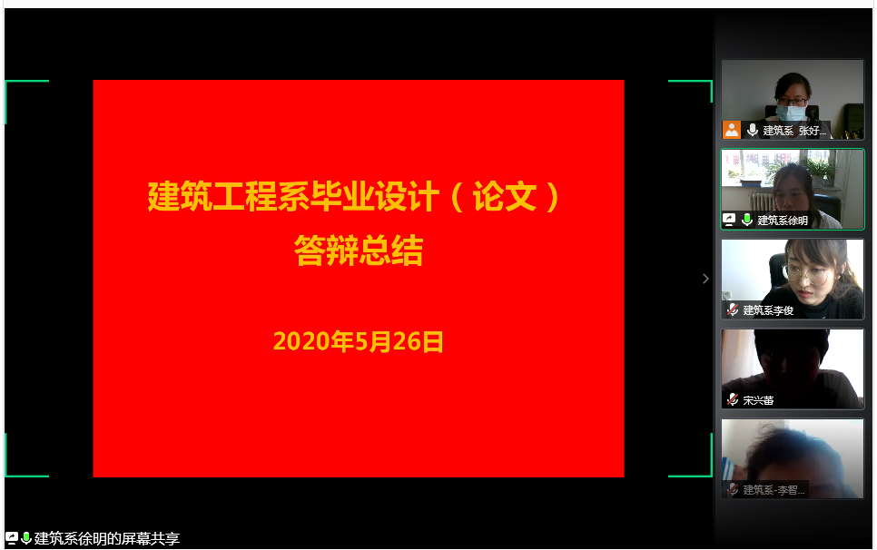 建筑工程系于2020年5月26日,组织召开毕业设计(论文)阶段总结会,会议由教学副主任徐明主持,本科专业负责人李智慧、张好徽、李俊、宋兴蕾和专科专业负责人侯荣立、曲梦露6位老师参加。