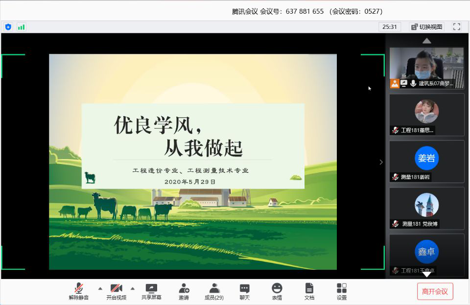 为了深化学风建设,营造良好的学习氛围,提高学习效率,促使学生全面发展,工程造价专业181班与工程测量技术专业181班全体同学于2020年5月29日举行以“优秀学风,从我做起”为主题的网络会议,由专业负责人曲梦露老师主持。