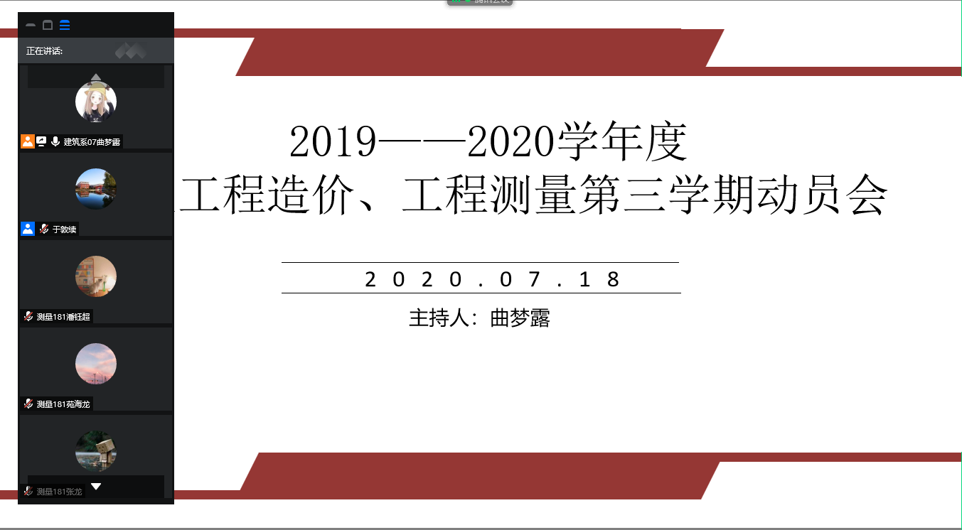 为了使学生能够熟练运用知识解决实际问题,让理论和实践相结合,增强诚实劳动意识,培养学生综合运用“五会”的能力,于7月18日13时在腾讯会议召开第三学期实习动员大会,本次班会由专业长曲梦露老师主持,辅导员于敦续老师及工程造价181和工程测量181全体成员。