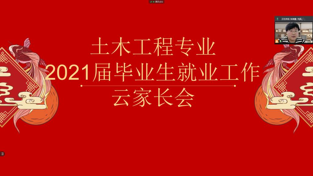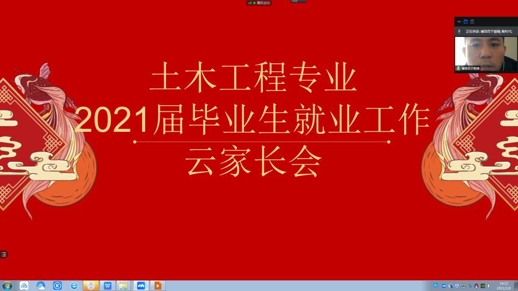 2021年1月6日,土木工程专业利用腾讯会议平台组织2021届毕业生就业动员云家长会。本次会议由土木工程专业负责人钟美慧老师、2021届辅导员于敦续老师主持,2021届毕业生、毕业生家长以及土木工程专业赵玖香老师、郝丽娜老师、王雪老师、贺全德老师参加次会议。
