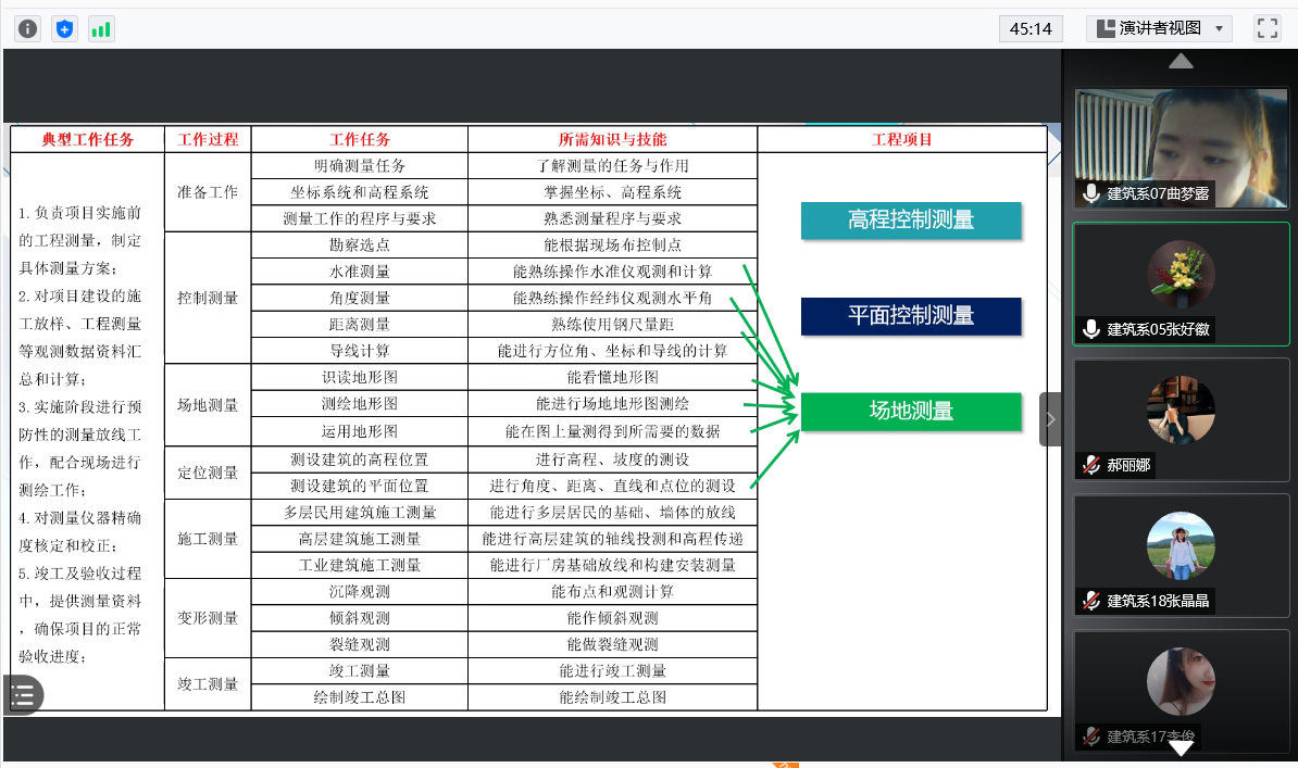 曲梦露老师担任工管20级《工程测量》课程的教学工作,针对社情、学情,结合“以学生为中心”的教育思想,曲老师设计5个项目任务,难度逐步深入,全面培养学生的测量实践技能。