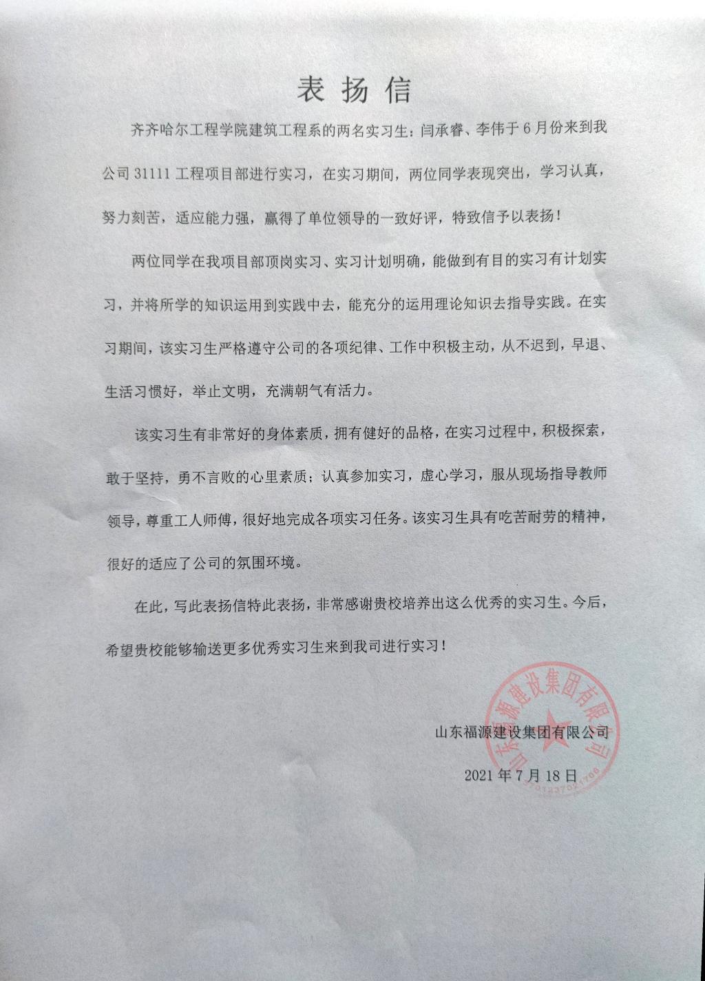 2021年7月18日,建筑工程系迎来喜讯。工程管理专业191班闫承睿、192班李伟两人在山东福源建设集团有限公司31111工程项目部实习期间表现优秀,获得了优秀实习生称号,被单位领导给予表扬!