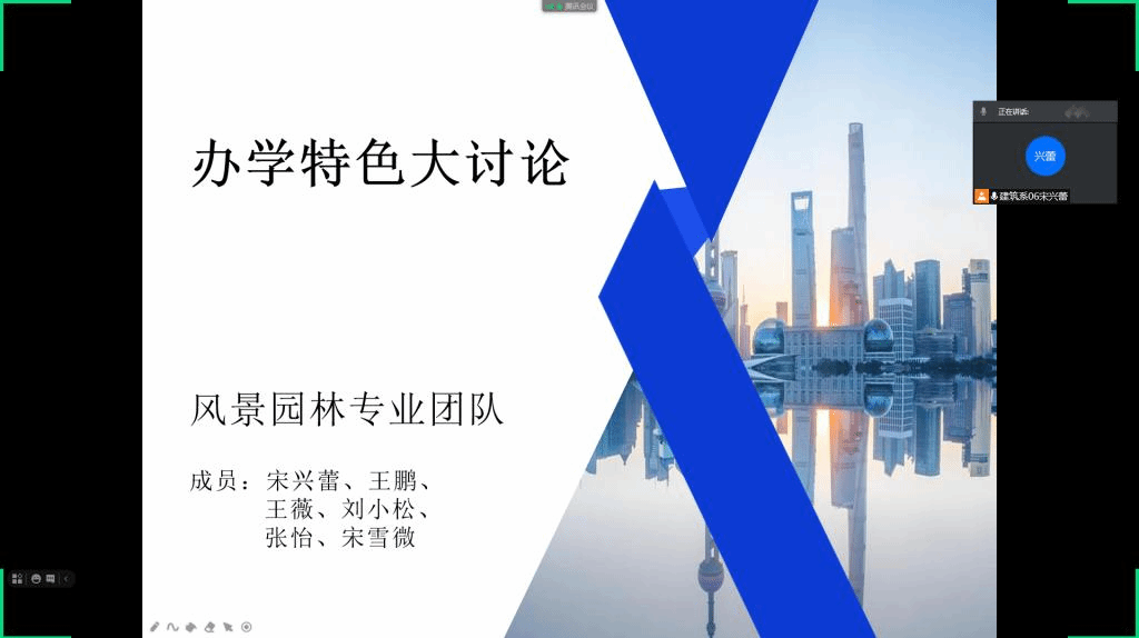 2021年8月20日上午9:00,建筑工程系风景园林专业通过腾讯会议平台和线下讨论相结合的方式开展办学特色大讨论活动。风景园林专业长宋兴蕾,专业教师王鹏、王薇、刘晓松,事务员张怡以及辅导员宋雪微参加此次会议。