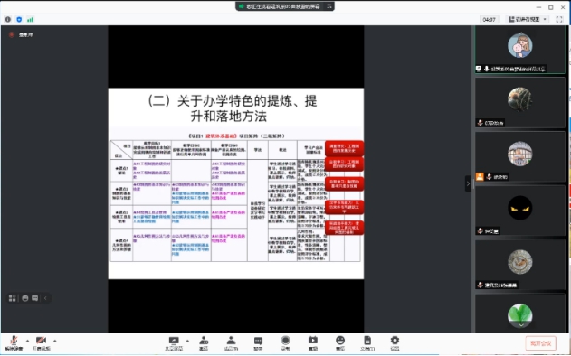 2021年8月22日18:30-19:30,建筑工程系组织学校办学特色大讨论阶段成果汇报会,采取腾讯会议形式,三个专业团队对讨论成果进行交流汇报,徐明副主任主持会议。