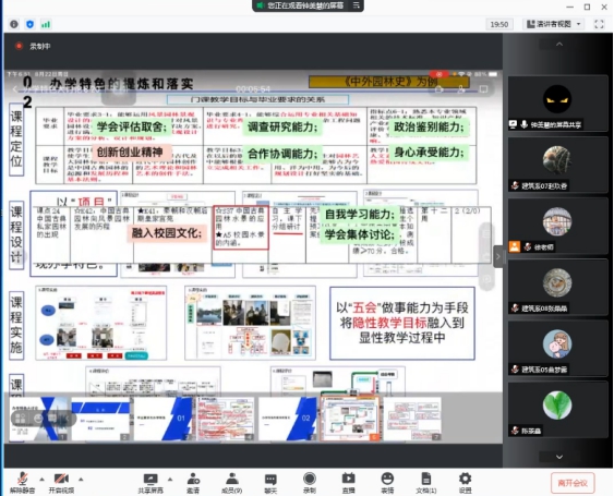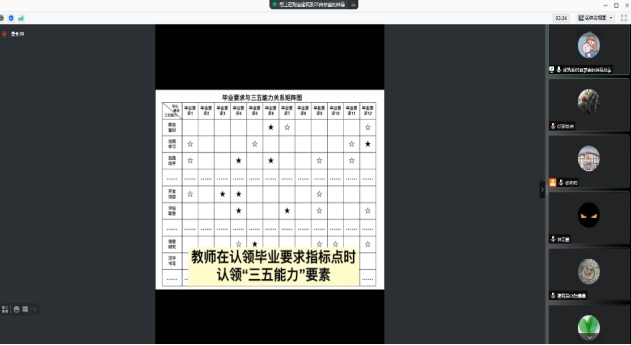 各专业在汇报中,分别交流了对专业认证中毕业要求内涵与“三五能力”对应关系的理解,建立毕业要求指标点与“三五能力”矩阵关系表,并分别以门课为例展示“三五能力”如何融入课程设计,在课点中的具体考核方式和评价标准;并将全员导师制落实在课程管理中,在制度、组织、质量、环境、思想等方面进行全方位建设,对不同主体制定考核量化表。