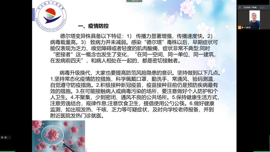 此次会议在学校风景航拍视频下拉开帷幕。会议上,于敦续老师结合当下德尔塔病毒提醒同学们来校途中佩戴口罩,注意安全。到校后从南门入校提供核酸证明,并扫码、测温进入校园。学校的志愿者会带领新生到四公寓一楼缴纳学费、寝室费并选寝室等一系列活动。随后于敦续老师也讲解了一些到校后的注意事项,如男生头发不能过长、男生和女生不能染发,家长进校园内不得吸烟、进入食堂一定要戴口罩等,同时也温馨的提醒同学们近日齐齐哈尔经常下雨要随身带伞等。张晶晶老师也就新生即将到来表示热烈欢迎,并带来了亲切的问候,嘱咐同学们来校途中不要和陌生人交谈。会议的最后,于敦续老师再次叮嘱同学们注意安全,并期待他们的到来。