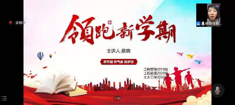 为了更好的开展新学期工作,确立新学期工作和学习目标,建筑工程系辅导员蔡爽老师,开展了领跑新学期主题班会,由于部分学生还未返校,本次会议在腾讯会议召开,本次会议由工程管理2019级、工程管理2020级、土木工程2020级全体学生参加。