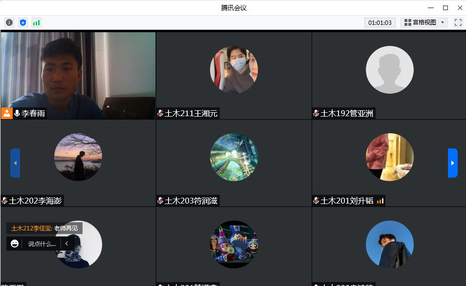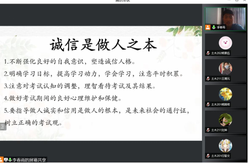 2021-2022学年第二学期补考工作正在进行,为了让同学们树立文明考风、诚信考试的理念,以积极向上的状态迎接正在进行的补考以及接下来的期末考试,建筑工程系土木工程专业李春雨老师组织土木工程专业大一至大三全体同学召开线上文明考风、诚信考试主题教育会议。