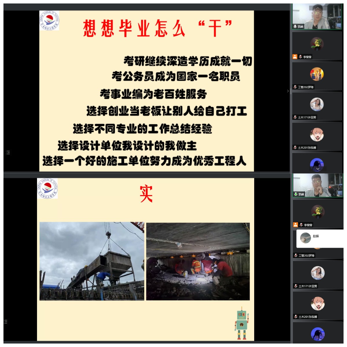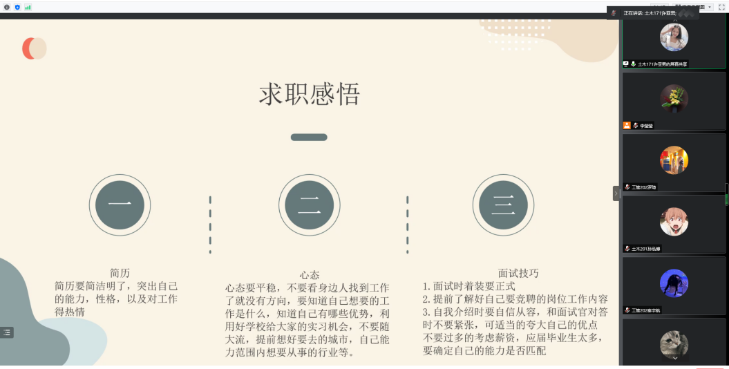 2022年5月13日晚,建筑工程系生涯导师李莹莹、李月凤、张怡邀请土木工程专业2021届毕业生许亚男、尤凯峰利用腾讯会议进行了校友经验分享会。会议由李莹莹主持,土木工程专业、工程管理专业、风景园林专业40余名学生参加。
