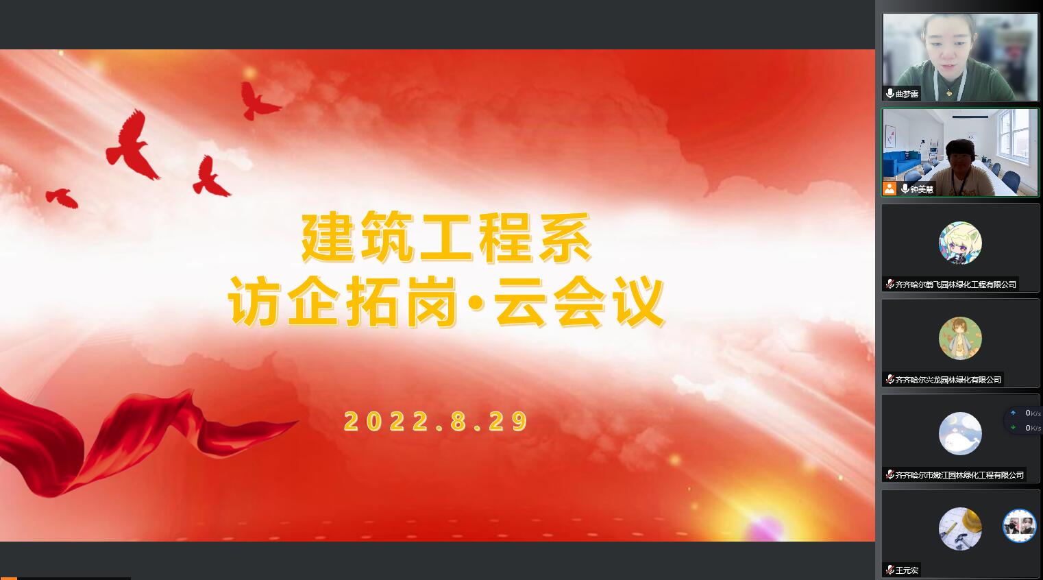 为贯彻落实《黑龙江省高校书记校长访企拓岗促就业专项行动的实施方案》精神,进一步促进建筑工程系就业工作,8月29日建筑工程系土木工程专业、工程管理专业和风景园林专业进行线上访企拓岗活动。参加会议领导有齐齐哈尔工程学院副院长张振笋、建筑工程系主任陈景鑫,以及钟美慧、曲梦露和赵玖香三位专业长,云南兴宏建筑有限公司、丰汇国际项目管理有限公司黑龙江分公司、黑龙江金佰诚工程管理服务有限公司、齐齐哈尔兴龙园林绿化有限公司、齐齐哈尔鹤飞园林绿化工程有限公司和齐齐哈尔市嫩江园林绿化工程有限公司六家单位参加,土木工程专业长钟美慧主持会议。
