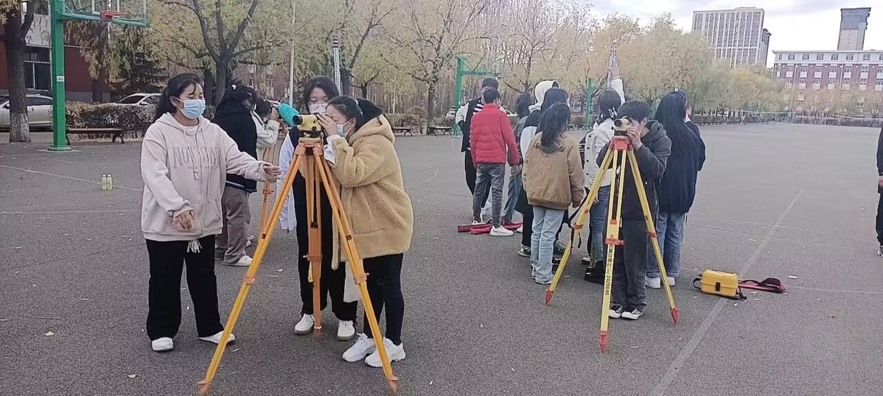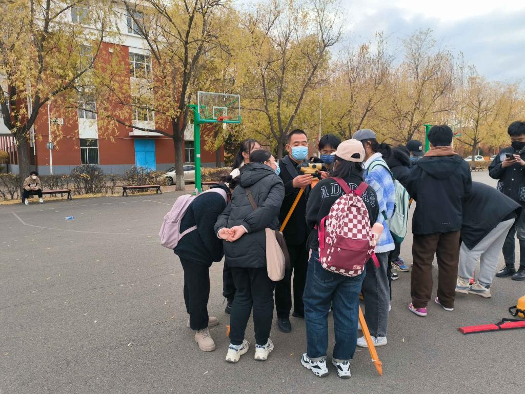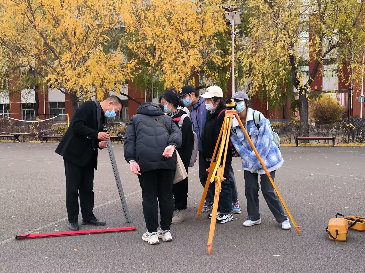 测量开始前,贺老师首先给同学们讲述了对工程测量的认知,包括技能本领、应用领域和就业前景等内容,并具体讲解并演示了水准仪和经纬仪的使用方法。之后测量兴趣小组成员指导各组同学分别对所分配区域进行测量。在测量过程中,同学们都不惧严寒,认真操作,积极协作,无一怠慢。贺老师逐一对各组测量过程中存在的问题进行指导,有针对性的解答同学们遇到的困难。