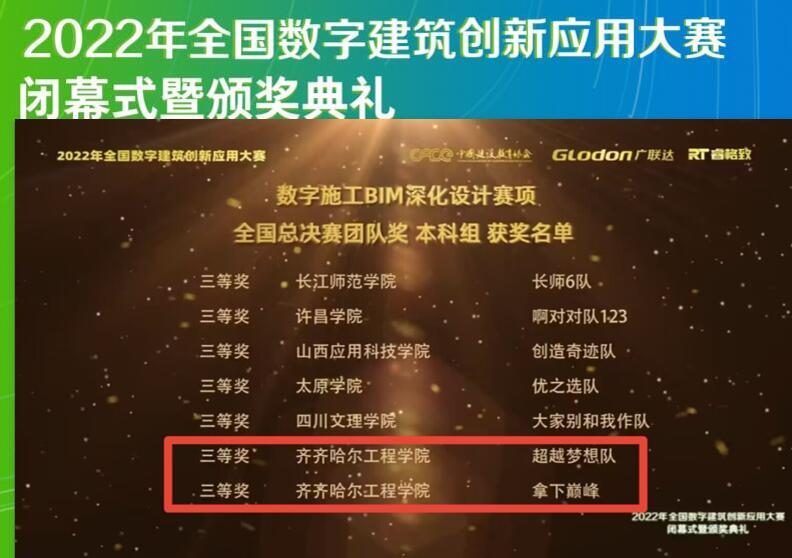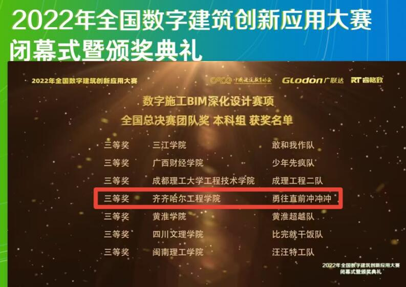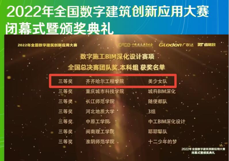 2022年全国数字建筑创新应用大赛闭幕式暨颁奖典礼于11月26日在线上举办,会上公布了全国总决赛团队奖获奖名单,土木工程专业共有4个团队荣获三等奖,分别是美少女队、超越梦想队、拿下巅峰队和勇往直前冲冲冲队。