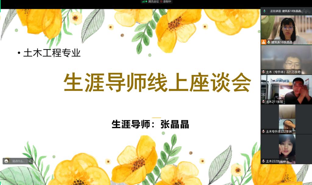 生涯导师是对大学生进行价值引领的核心力量,是实现立德树人目标的重要依托。近日,土木工程专业生涯导师们利用线上线下等多种形式召开了生涯学生座谈会,座谈会的主要内容是关心和解决生涯学生在心理、生活、学习、返乡以及就业等方面的问题。
