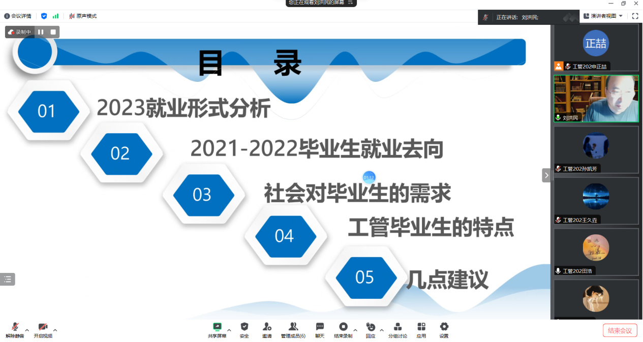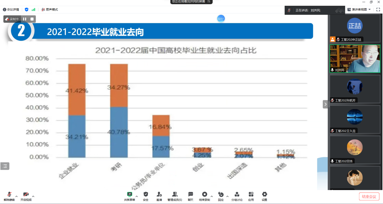 会议开始时,刘洪民老师致辞,并鼓励即将毕业的同学们为自己的未来做好准备。主要从五个方面进行整体讲解,2023年就业形式分析、2021-2022毕业生就业去向、社会对毕业生的需求、工管毕业生的特点和几点建议。