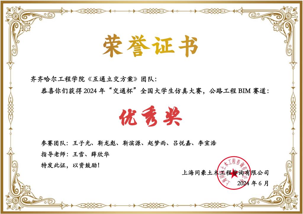 近日,我校建筑工程系土木工程专业学生在2024年“交通杯”全国大学生仿真大赛中取得了显著成绩。其中,“互通立交方案”团队(成员包括王子光、靳龙彪、靳滨源、赵梦雨、吕悦嘉、李宣浩)与“通天大道”团队(成员包括魏京豪、张缔、孟祥瑞、王振权、马桂玲、朱茂)均荣获了优秀奖,这是对我校学子专业素养和实践能力的充分肯定。