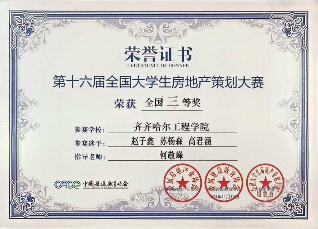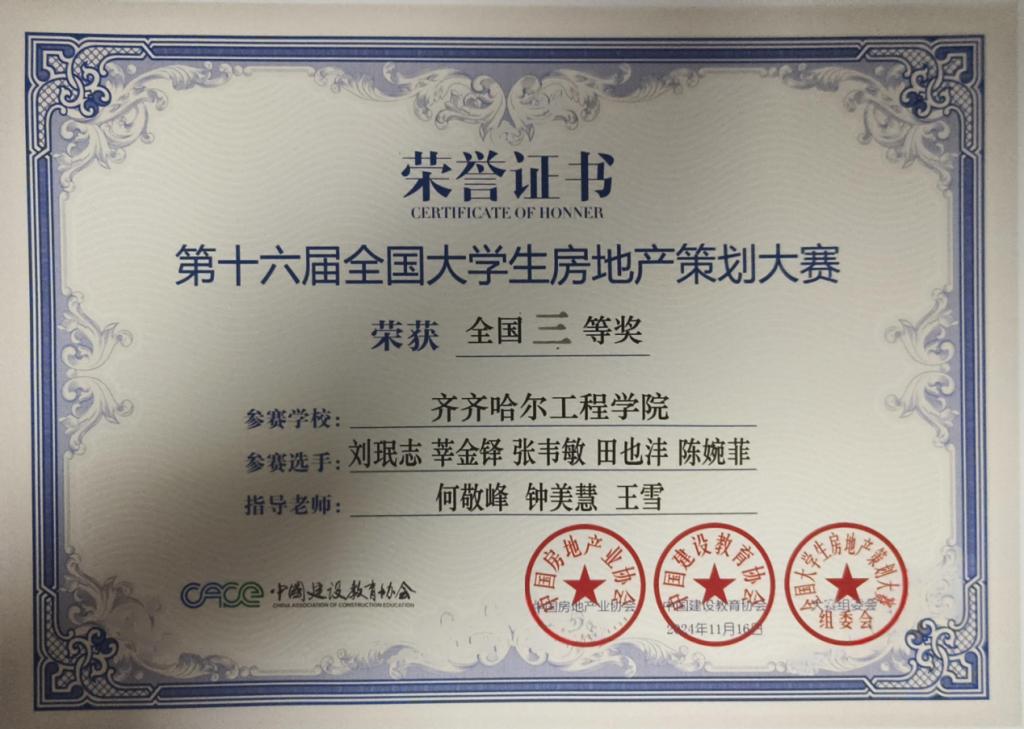 近日,第十六届全国大学生房地产策划大赛传来喜讯,我校建筑管理工程系学生在比赛中斩获佳绩。其中土木工程专业“欢乐斗地主队”“希望小队”团队荣获房地产开发项目策划赛道三等奖;工程管理专业“芝士派队”团队荣获城市更新项目策划赛道三等奖。