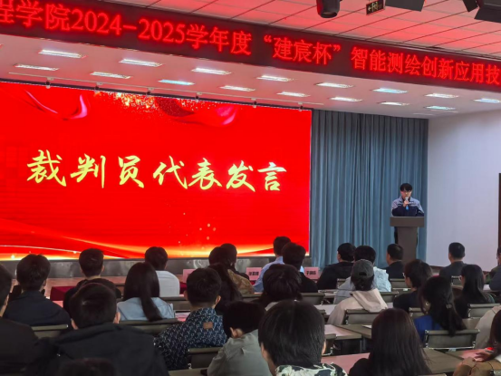随后由裁判员工管232班兰红宇代表发言,他表示测绘技术作为工程建设的基石,在现代社会发展中起着举足轻重的作用。智能测绘更是借助先进的科技手段,为我们打开了一个全新的视角,赋予了测绘工作更高的精度、效率和智能化水平。同时,他承诺将以高度的责任感和使命感,认真履行裁判职责。严格遵守竞赛规则和评分标准,秉持公正、公平、公开的原则,严肃认真地对待每一个比赛环节,客观准确地评判每一位选手的表现。