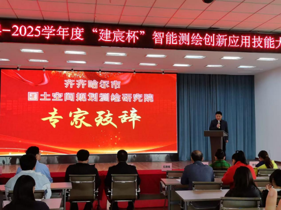 最后,由齐齐哈尔市国土空间规划测绘研究院专家石善福院长上台致辞。专家在致辞中对本次大赛的举办表示热烈祝贺,强调了智能测绘技术在当今社会发展中的重要性,并对齐齐哈尔工程学院在测绘人才培养方面所做出的努力给予了充分肯定。他鼓励参赛学生珍惜这次难得的机会,积极展示自己的才华,在比赛中相互学习、共同进步,不断提升自己的专业技能和综合素质,为未来投身测绘行业打下坚实的基础。同时也希望通过此次大赛,能够加强学校与行业之间的交流与合作,共同推动智能测绘技术的创新与发展。