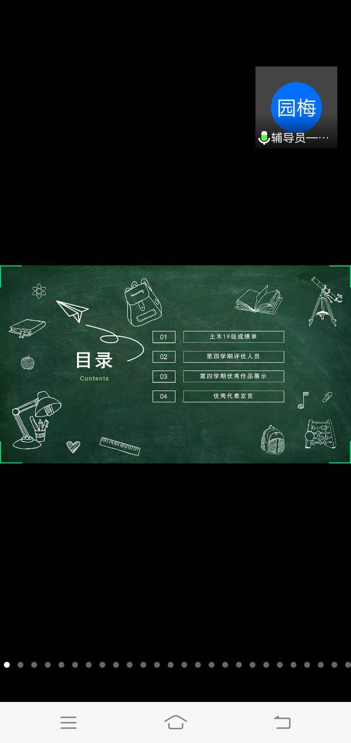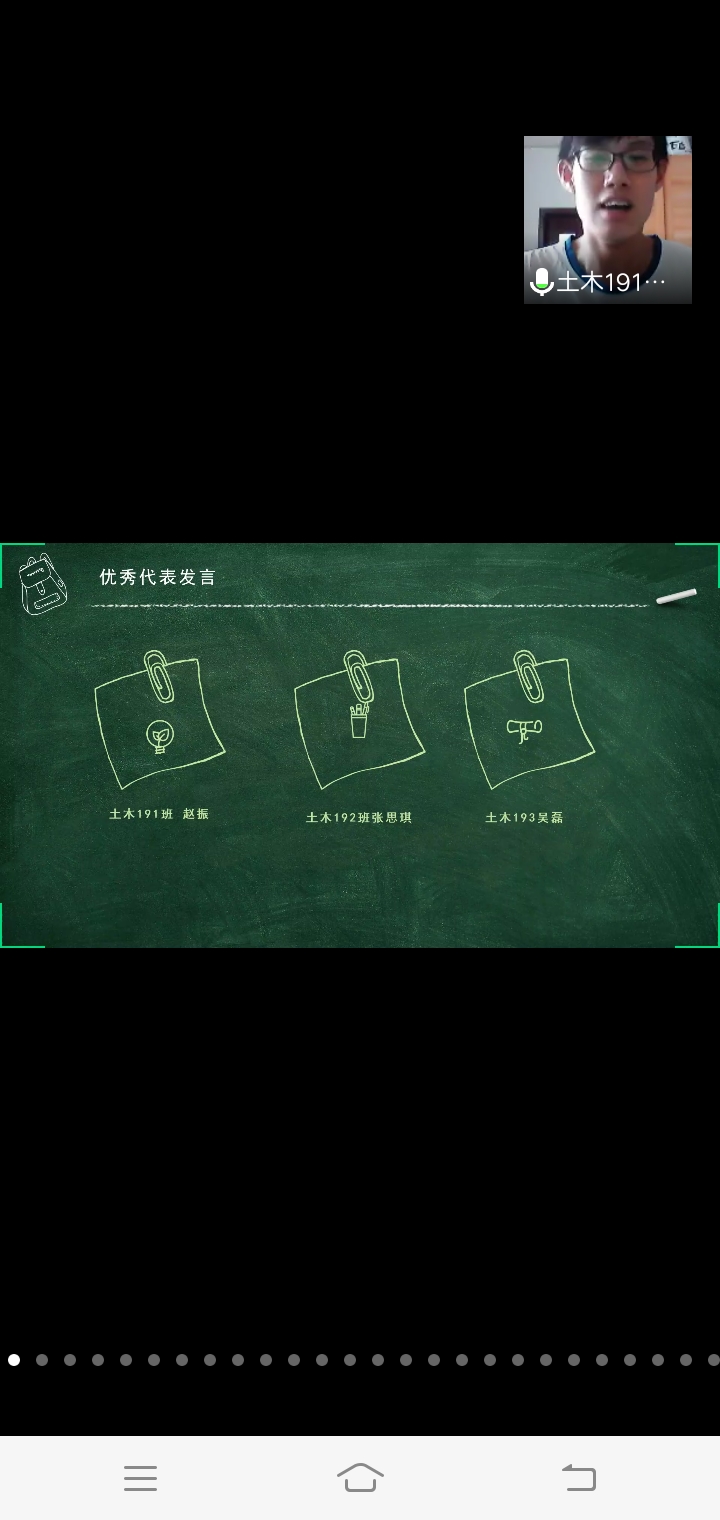 第三项由第四学期评优的学生进行个人优秀作品展示。第四项由优秀学生代表土木191班赵振,土木192班张思琪,土木193班吴磊代表发言。此次会议展示了书法、拼图、第四学期感悟、感恩视频等优秀作品,充分体现出了土木19级学生对第四学期的重视性和完成工作的认真性。在此次会议的结尾,姬老师也不忘叮嘱学生做好疫情中个人防护工作,并且强调由于黑龙江疫情工作依然严峻,在没有接到正式通知的情况下,学生不可提前返校返齐。