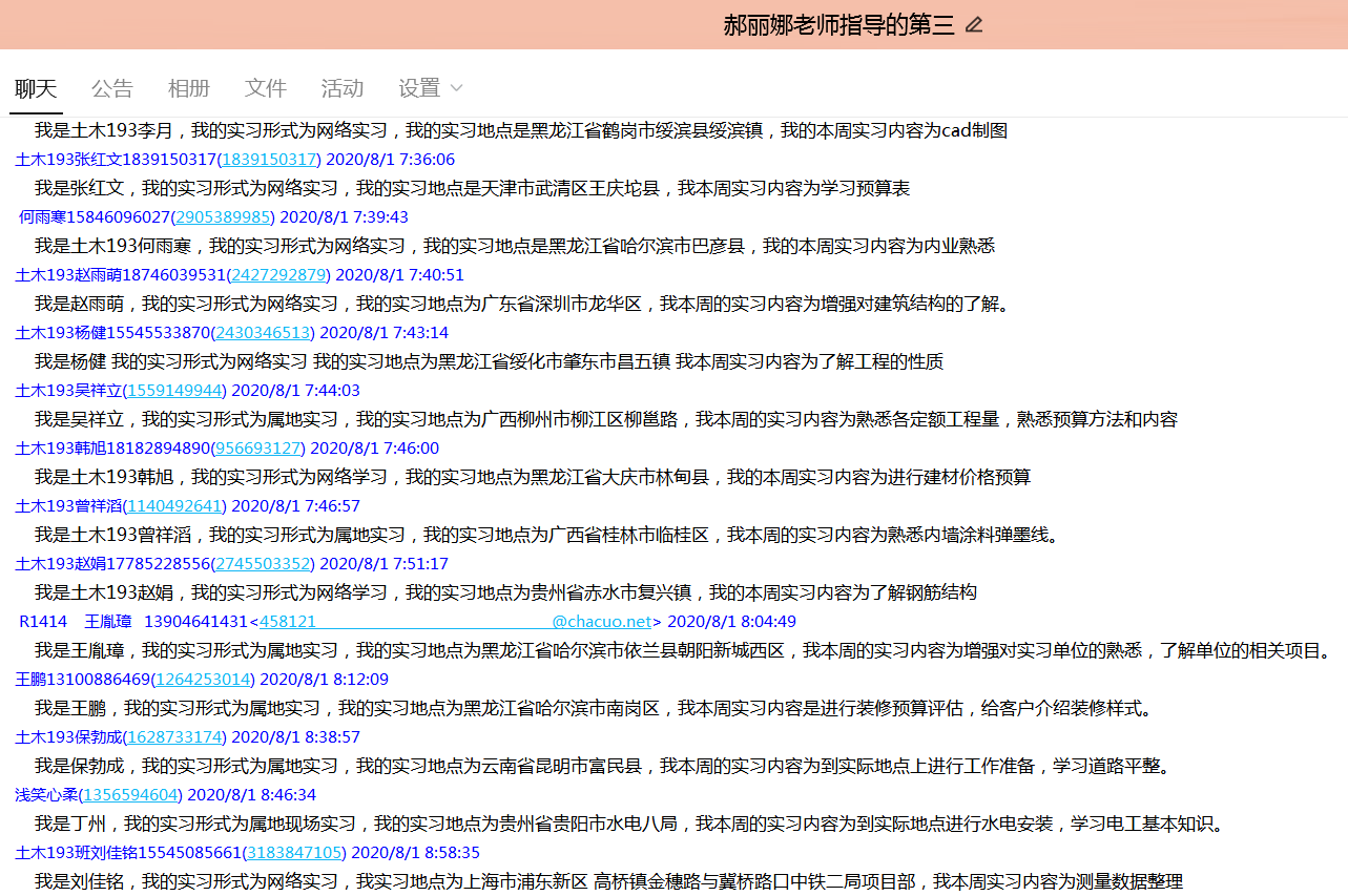 第三学期实习已经过去两周,8月1日,土木193班郝丽娜老师指导小组线上召开第三学期实习指导会。本次会议由指导教师郝丽娜主持,采用腾讯会议和QQ群进行,郝丽娜老师指导的32名同学全部参会。