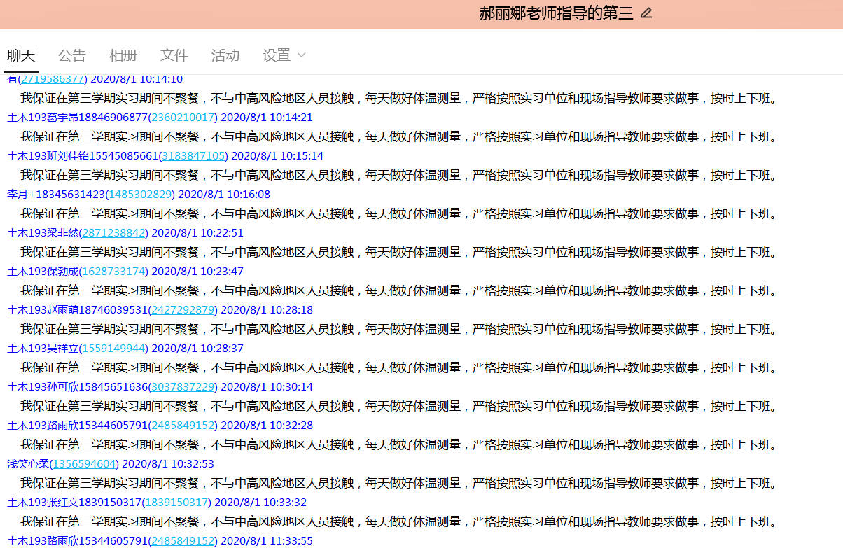 学生通过QQ群汇报了本周的实习内容及心得感悟。本次会议,郝丽娜老师针对学生汇报的内容及遇到的问题进行指导,并对第三学期实习同学进行安全教育,再次强调无论是属地实习还是居家完成任务都要做好疫情防护工作。在第三学期实习期间要做到不聚餐,不与中高风险地区人员接触,每天做好体温测量,在现场实习的同学要注意施工现场安全,严格按照公司和现场指导教师要求做事,按时上下班。另外,郝丽娜老师还指出了近两周实习中发现的问题,并再次说明第三学期实习成果的具体形式及注意事项。