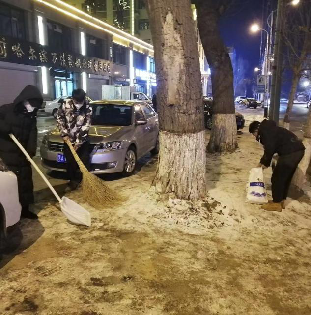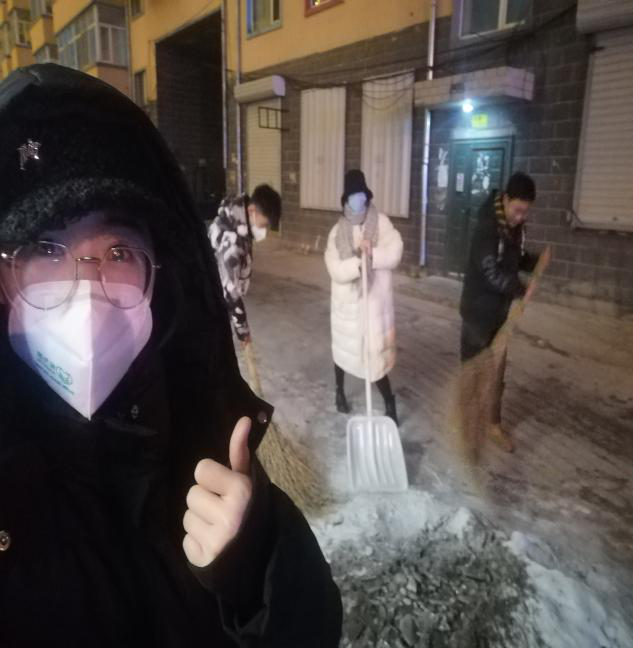 天刚蒙蒙亮,我们JZ—GY087小组,组长穆天琦紧急联系小组成员孙长超、吴思思、王涵开展社区志愿扫雪活动。社区统一部署清雪工作,对社区工作人员、志愿者有序组织开展积雪清扫工作。大家皆弓着身子,一锹一锹地将路面积雪清除,干净的路面才一点点得以露出来。大雪不可怕,大家都伸一把手,方便你我他,大家都出力,社区才更加和谐!虽然扫雪的过程很辛苦,但能为群众办好事,是社区志愿者们最大的幸福和开心,也是我们小组践行学校第四学期活动的现实意义。