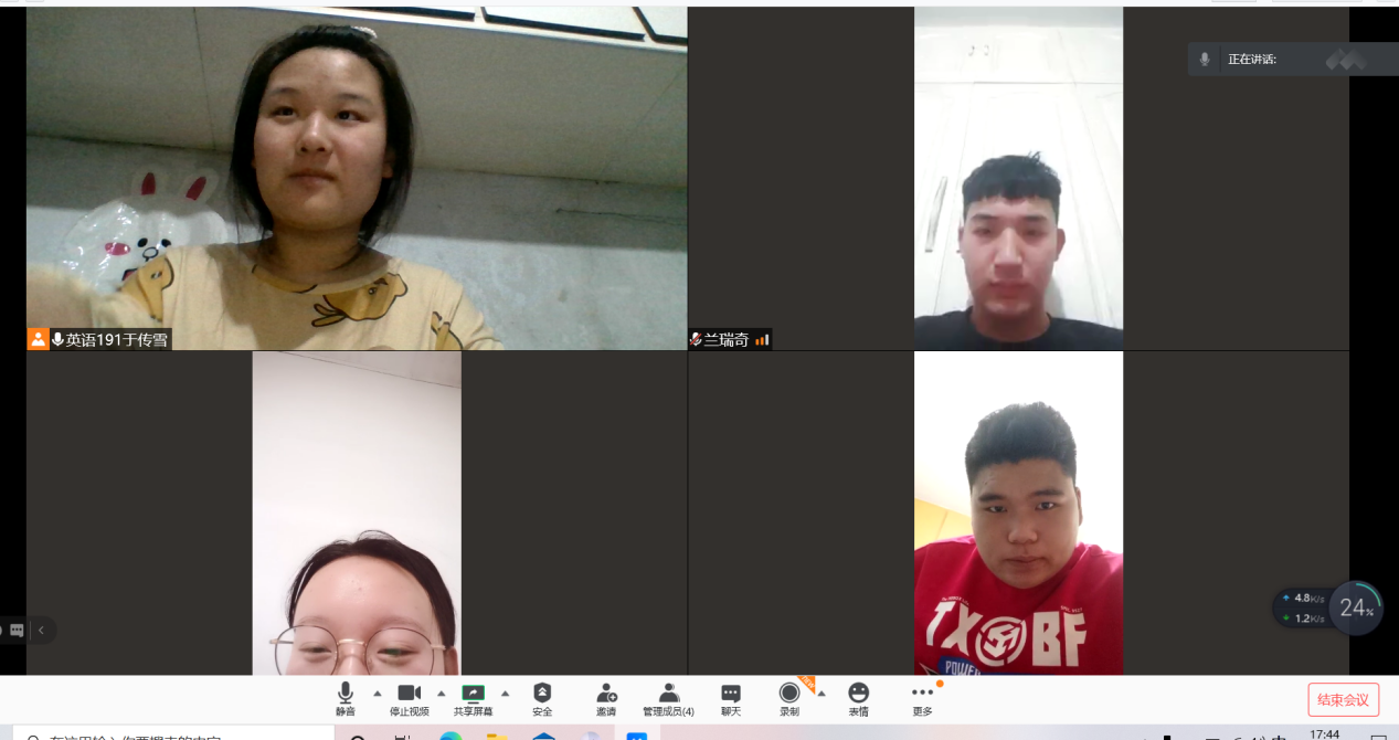 本小组成员由建筑工程系工管192班兰瑞奇、田昊、张闯和管理工程系英语191班于传雪组成。利用网络会议分享阅读书籍的感悟与收获。汉字书写是学习与发展的一项必备技能,我组每天认真临摹字帖,并完成相应的钢楷书写,并利用本次会议讨论了汉字书写的方法。
