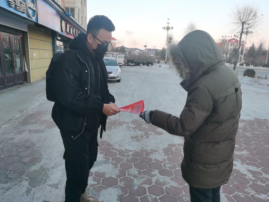 为贯彻落实党中央国务院及市委市政府有关疫情防控攻坚政策、加强公民和社区工作者的抗疫意识、提高人们在日常生活中佩戴口罩的自觉性,土木工程专业的公益JZ-GY045组于2021年1月20日在塔河县走进社区开展了第二次公益活动。