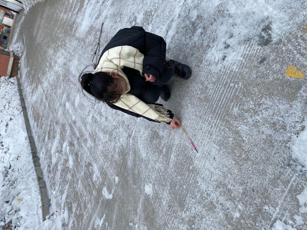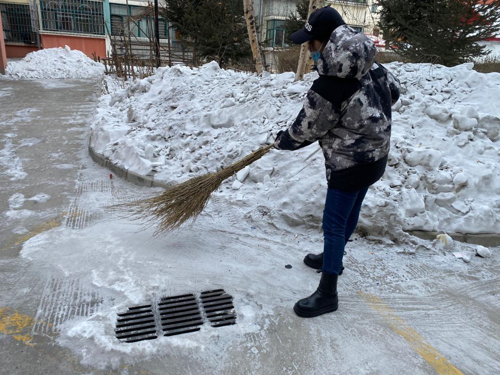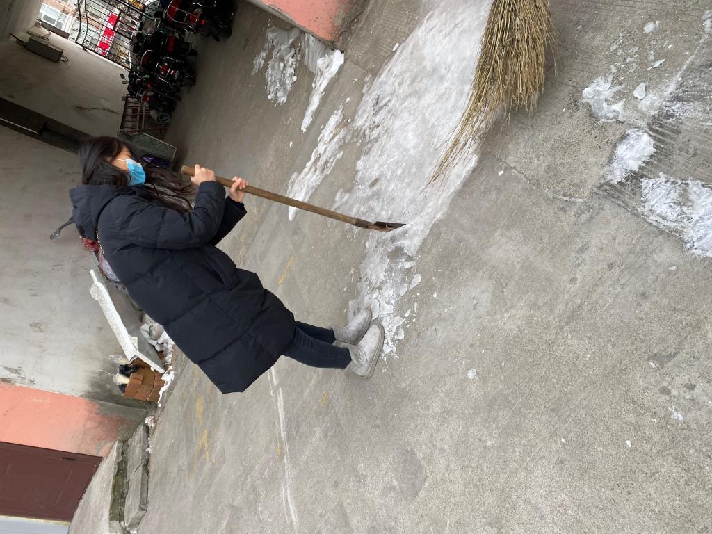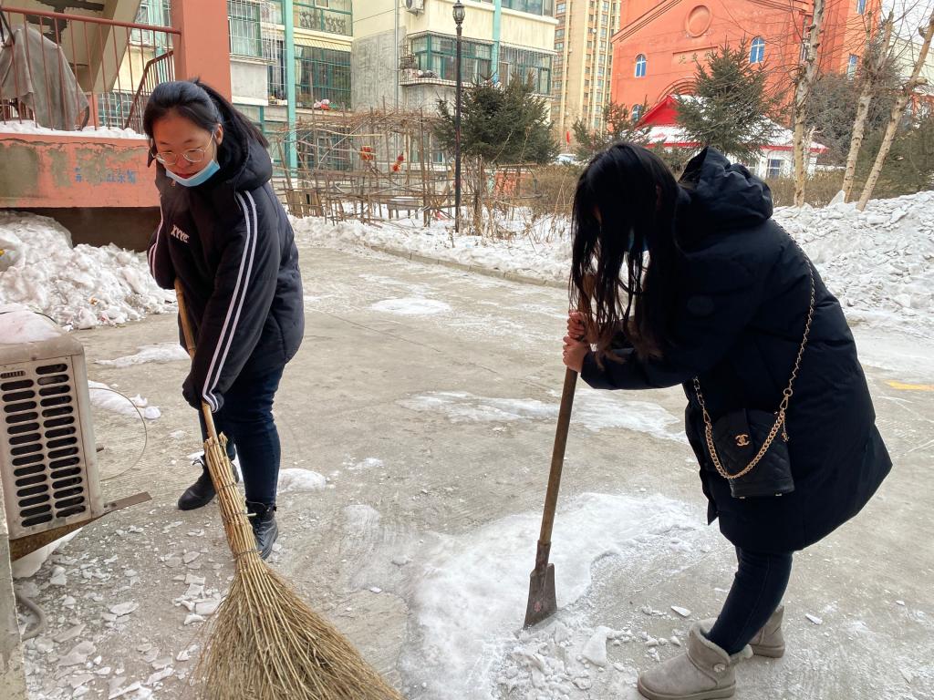 首先由小组组长与社区进行沟通交流,介绍本次活动的主要开展内容,在得到社区工作人员的同意下,小组成员开始在社区进行志愿活动。小组成员就清雪进行了明确分工,2人为一组,一个人负责将积雪从地上铲起,另一个人负责将铲下来的冰雪清走。清雪过后,小组又将对面的垃圾进行打扫清理,虽然天气寒冷但是成员们都很积极的进行活动,清理过后的路面,既干净卫生又保证了居民的出行安全。
