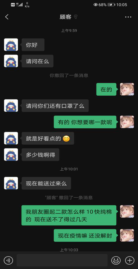 在家受疫情影响,需在家隔离,难以保证收到消息后准时发货,可能会损失一大批新老顾客。在疫情期间,由于运输特别不方便,导致物流特别慢,以至于一小批顾客在订完之后都取消了订单。在这个时间段,虽然口罩和酒精都是每个家庭的必需品,但是不能线上线下同时销售,只在线上销售导致了手上积压的货比较多。在微信这个生态环境里骗子很多,再加上初做微商,我的话语没有那么专业,导致我很难与客户建立信任关系。