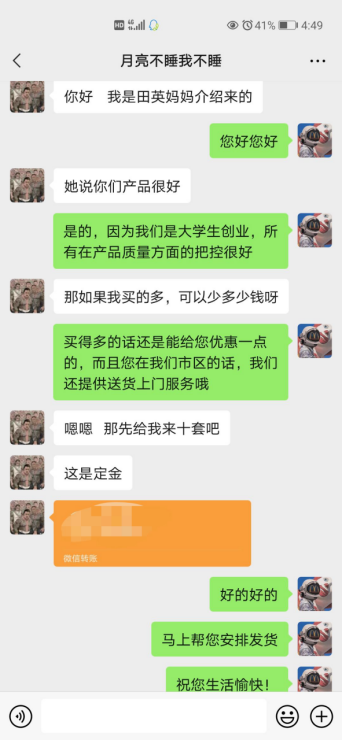 本周由于陈微微同学的伤病还没好,没有和我们一起进行线下活动,但他并没有什么也不做相反他组织我们小组的线上售卖活动,还给我小组带来了第一笔收如。