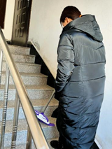 高君涵于2号周二中午12点30经行2个小时的打扫,邓继成与1号周一上午9点开始进行2个小时的打扫,鞠红娟于2号周一下午2点开始进行2个小时的打扫,徐岩于1号周一上午9点进行2个小时的打扫,楼梯扶手是我们上楼接触比较多的,我们先拿了一个干净的抹布,倒上了几滴消毒水开始擦,疫情期间楼梯扶手也是携带病毒的途径,所以我们擦的时候都很细心。我们擦了单元门上的把手,给每一家门的把手喷了酒精。