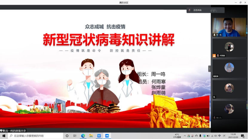 2021年2月20日,JZ-GY088组组长周一鸣,组员何雨寒,赵雨萌,张烨童顺利完成第四学期第五周公益活动任务,由于疫情防控原因,本周我组任务为线上开展疫情防控知识讲解。