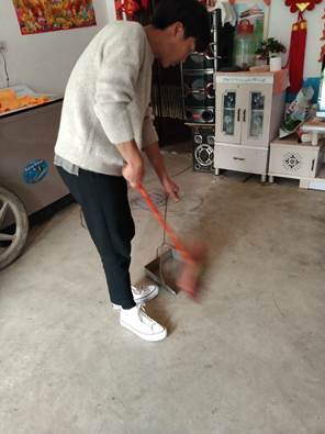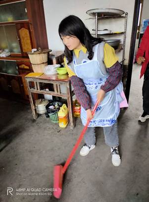黄佑荣同学在家里帮忙,此刻她正在扫地,同时我们发现她还系有围裙,因为她还帮着煮饭。张麟同学此时正在帮家里炒菜,体现了她的厨艺。陈东剑同学正在帮家里进行清扫,并收拾家里的东西。柯锐同学家正进行烧烤,她正帮着进行烤肉等。